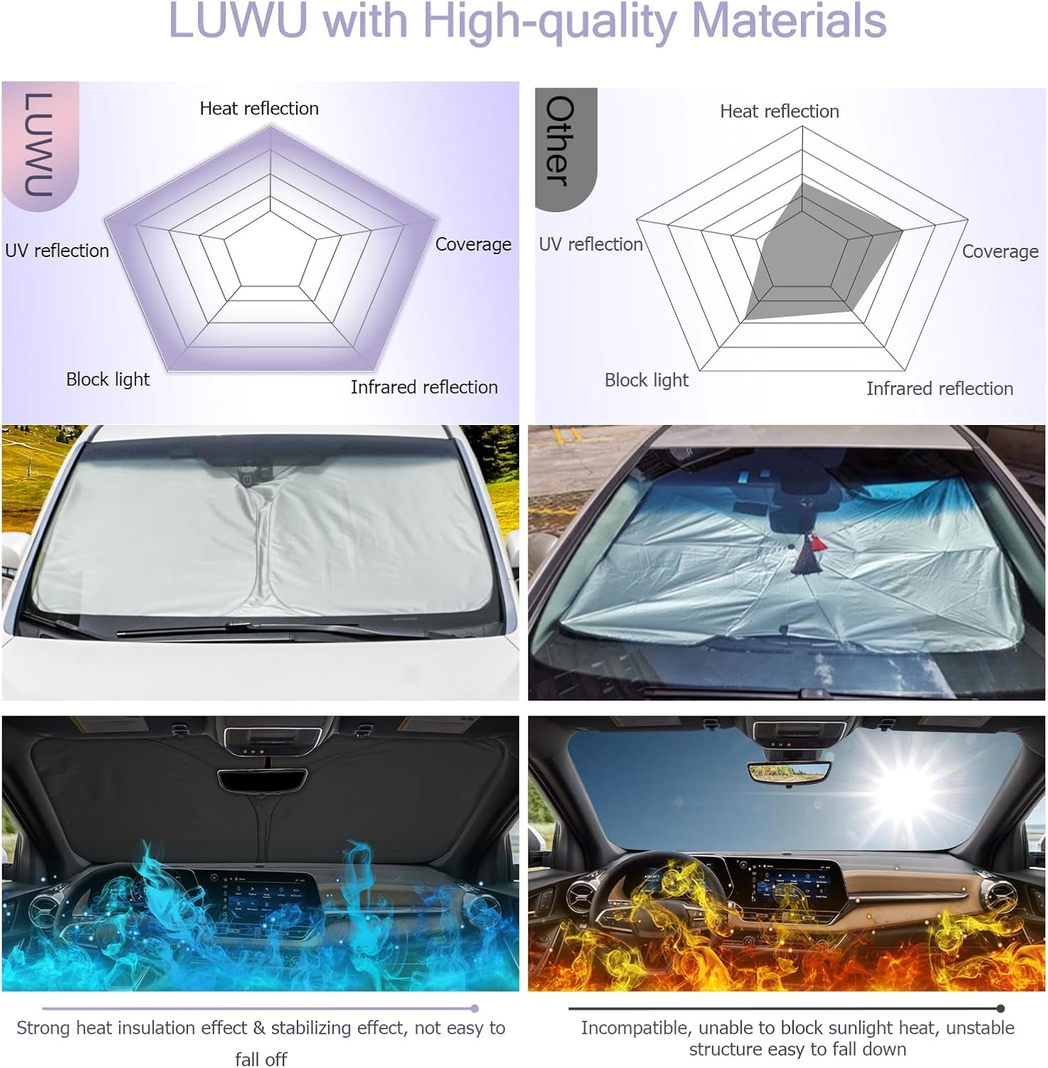 - 【Premium Protection】The windshield sunshade keeps your car internal relatively cool, effectively blocks sunlight, prevents harmful UV rays and heat from entering the car, and does not expose the steering wheel to strong sunlight for a long time, which can burn your hands. It can also protect car leather seats, instrument panels, display electronics, air outlets, etc. make them will not fade, crack, or fail
