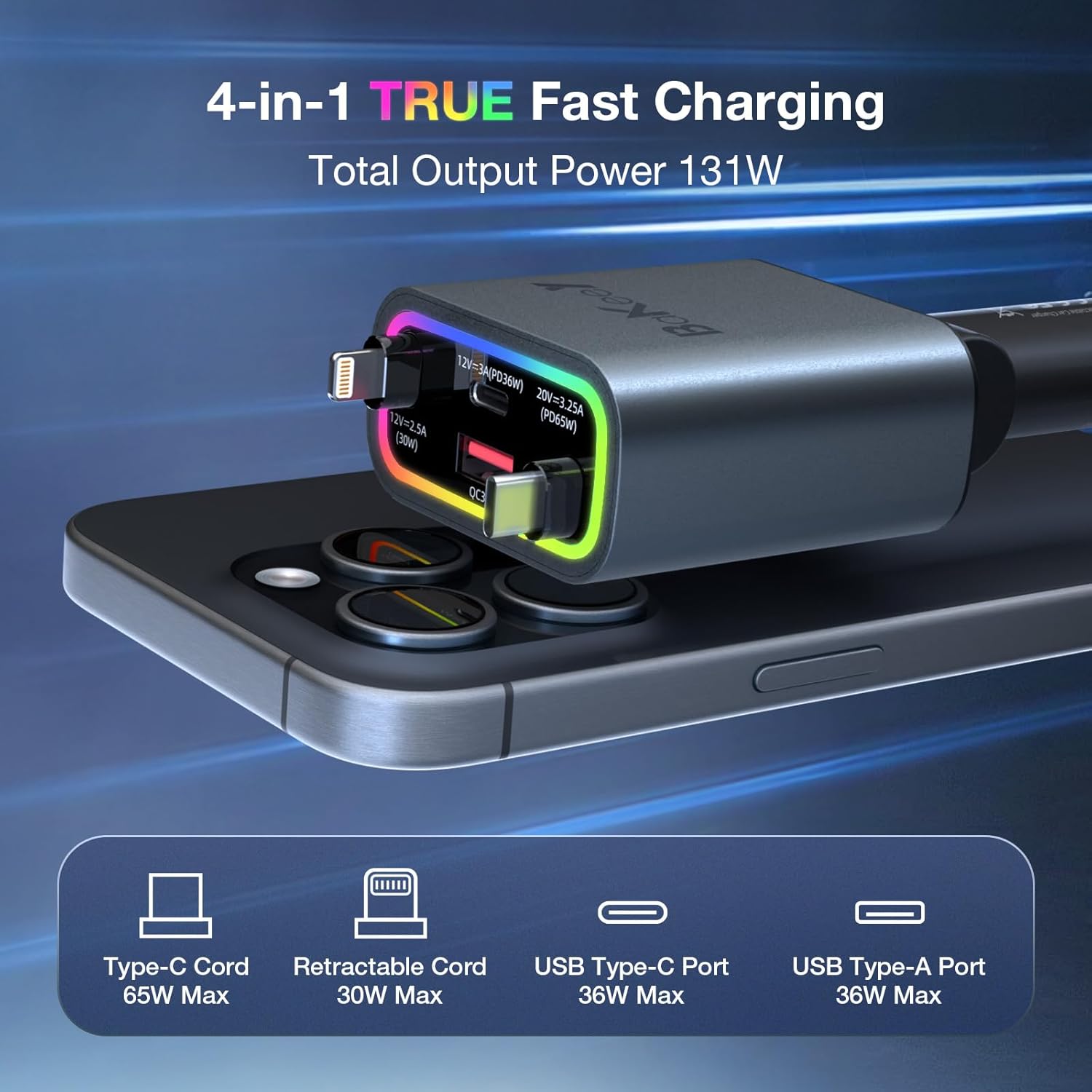 - 131W Car Charger 4-in-1:The car usb charger multi-port offers a maximum charging power of 65W Type-C fast charging cable and 30W retractable cable. The other two USB-C and USB-A ports output up to 36W. The total power reaches 131W, making it ideal for efficiently charging devices such as smartphones and tablets