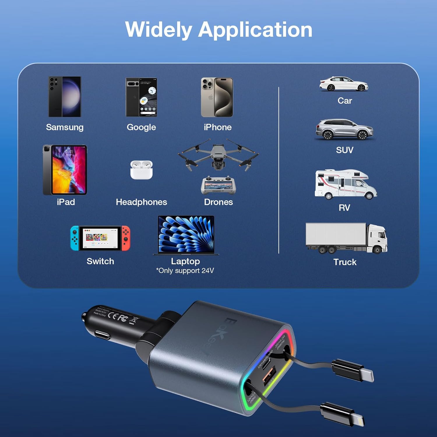 - Fast Charging: Use our fast car charger Type-C cable (PD 65W) to charge the iPhone 15 to 80% in 36 minutes and the Samsung S24 in just 26 minutes