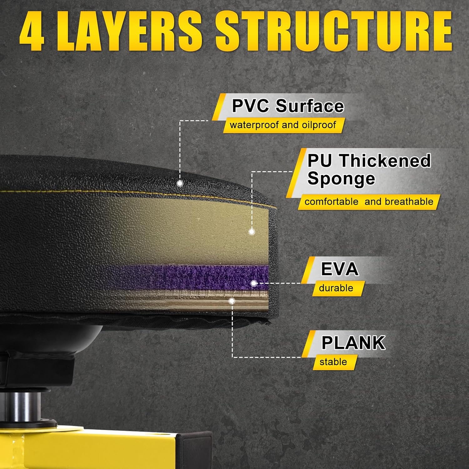 - 【4 layers Structure】The mechanic chair's thick cushion is 3.74"/9.5cm height and consists of FOUR layers structure. The first layer is a solid wooden plank, the second layer is a durable EVA, the third layer is a comfortable and breathable PU thickened sponge, and the fourth layer is a waterproof and oilproof PVC surface. Soft, Firm, and Comfortable. Make it easy to be cleaned
