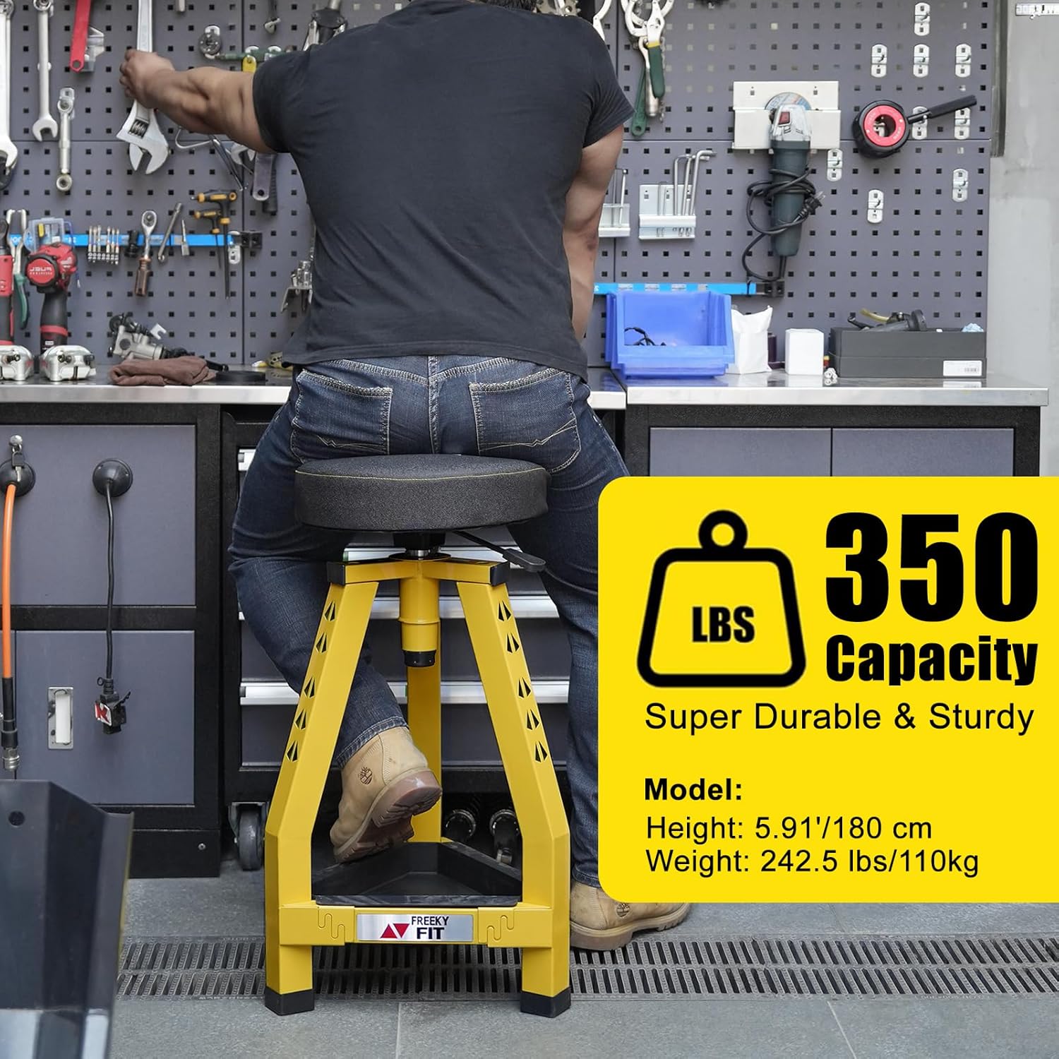 - 【350 LBS & 360°】The flexible 360° rotating seat provides greater range of motion and movement. The heavy duty mechanic stool is specially designed with a thick angle steel frame for long-lasting performance and reliability and footrest. Its design can withstand heavy use, with an overall weight capacity of around 350 pounds. It is a sturdy and practical choice for use in garages, workshops, working bar, and other places