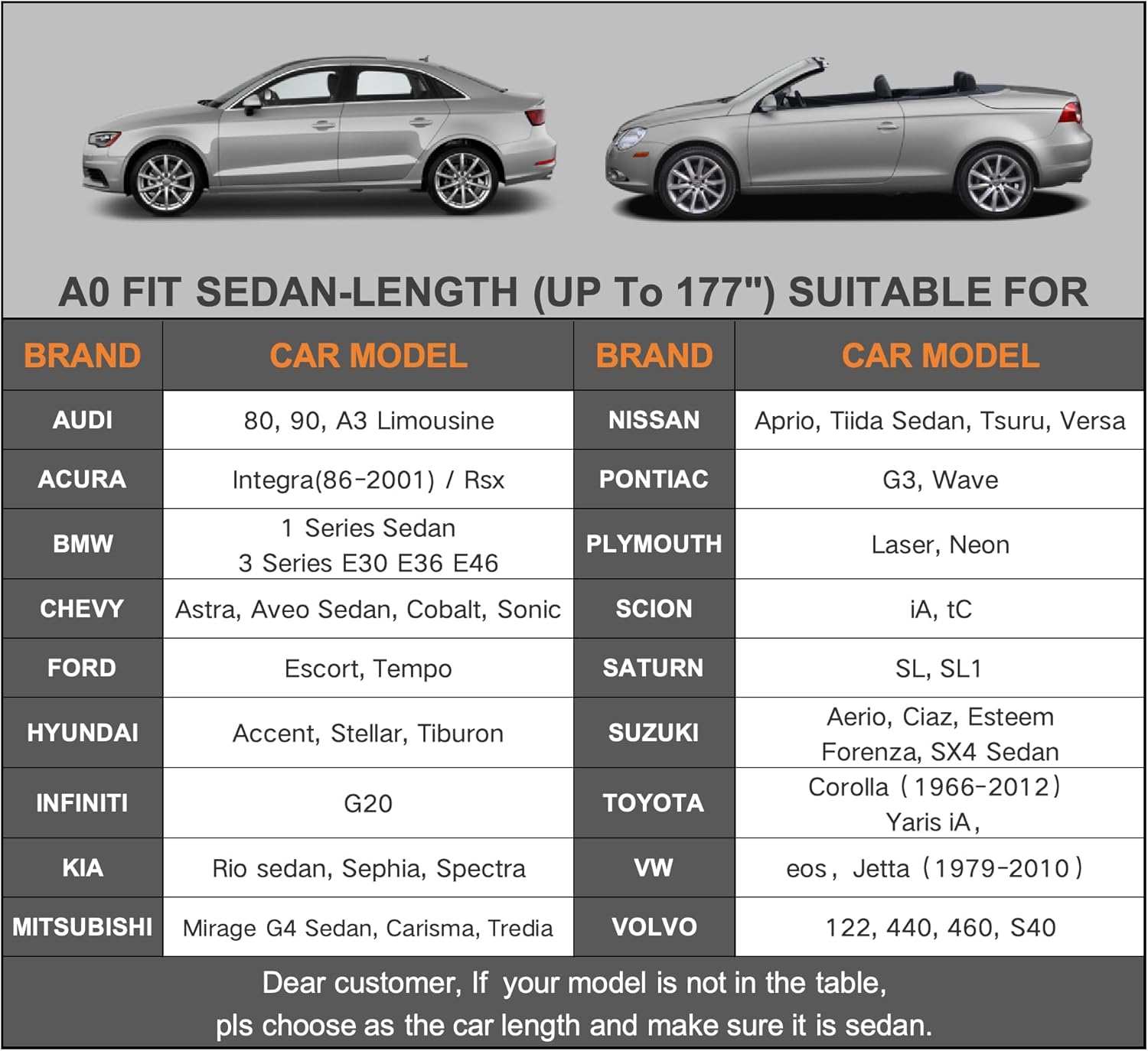 - 【Dimension A0】— Universal fit for sedan which length is up to 177 inch (NOT FOR SUV AND HATCHBACK). Suitable for BMW 3 Series E46 E36 E30, Nissan Versa, Dodge Neon, Mitsubishi Mirage, Audi A3 sedan, Acura Integra/Rsx, Hyundai Accent, Volkswagen eos, Toyota Celica,Chevy Cobalt etc.