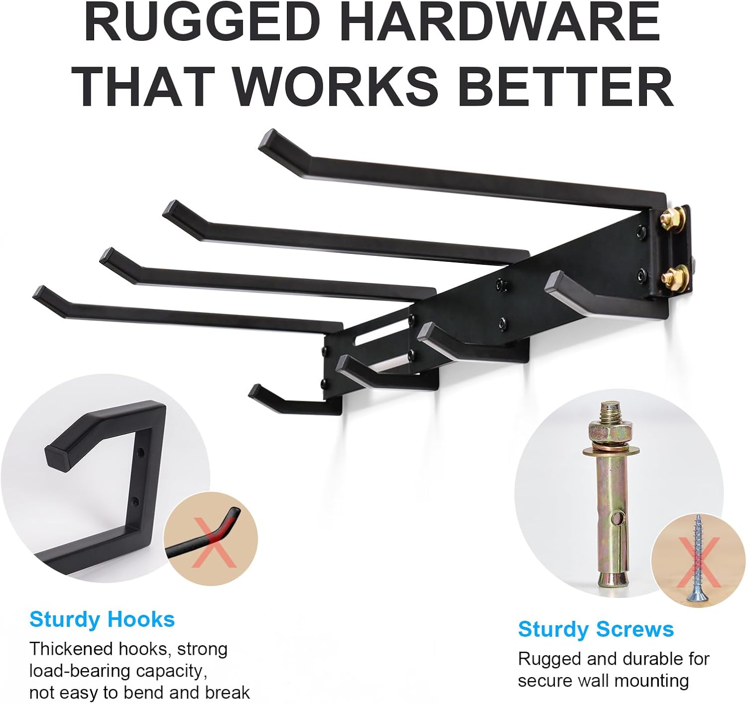 - Heavy Duty Garage Hooks: Made of strong and thickened metal frame with anti-rust coating,Mounting on concrete or masonry walls the maximum load-bearing capacity is 300 pounds, which can ensure long-term use and provide reliable support for your items.