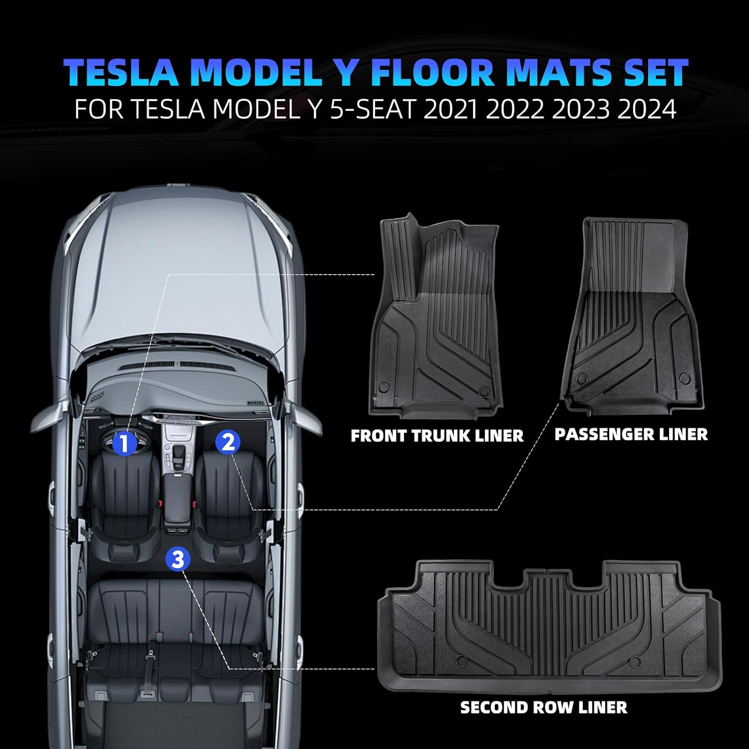 - Customized Fit TESLA MODEL Y: Protection with TPE (thermoplastic elastomer) material which ensures the mats more strength, resilience, durability and elasticity.The Tesla Model Y floor mats are compatible with tesla model y 2020-2024