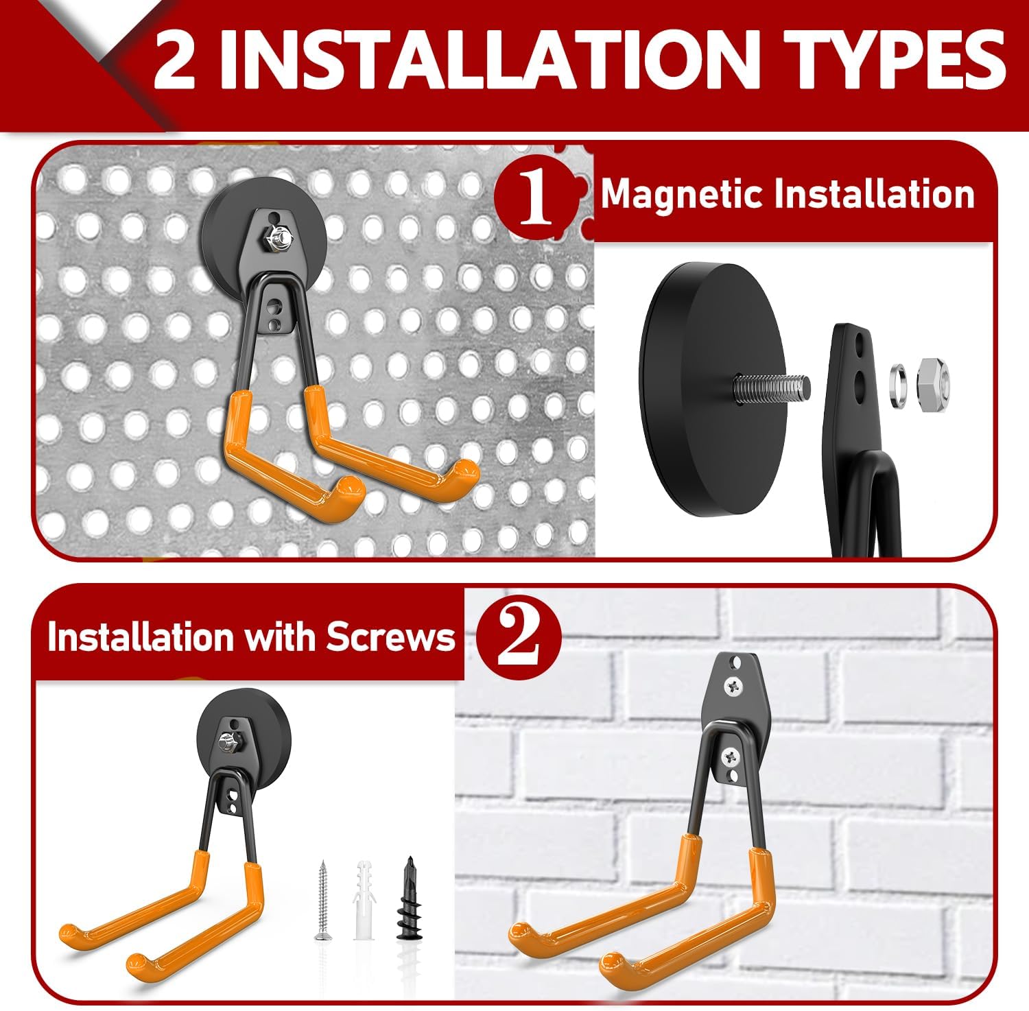 - Versatile and Effortless Installation: Enjoy the ease of our robust heavy duty hooks, offering two flexible usage options: (1) Perfect for metal surfaces, these garage magnetic hooks adhere simply without tools or drilling, ensuring no damage to the surface. (2) For enhanced versatility, the magnet can be detached, allowing independent use of the garage storage hooks. To securely store heavier tools, we provide robust screws that allow for a stable installation on multi-wall surface