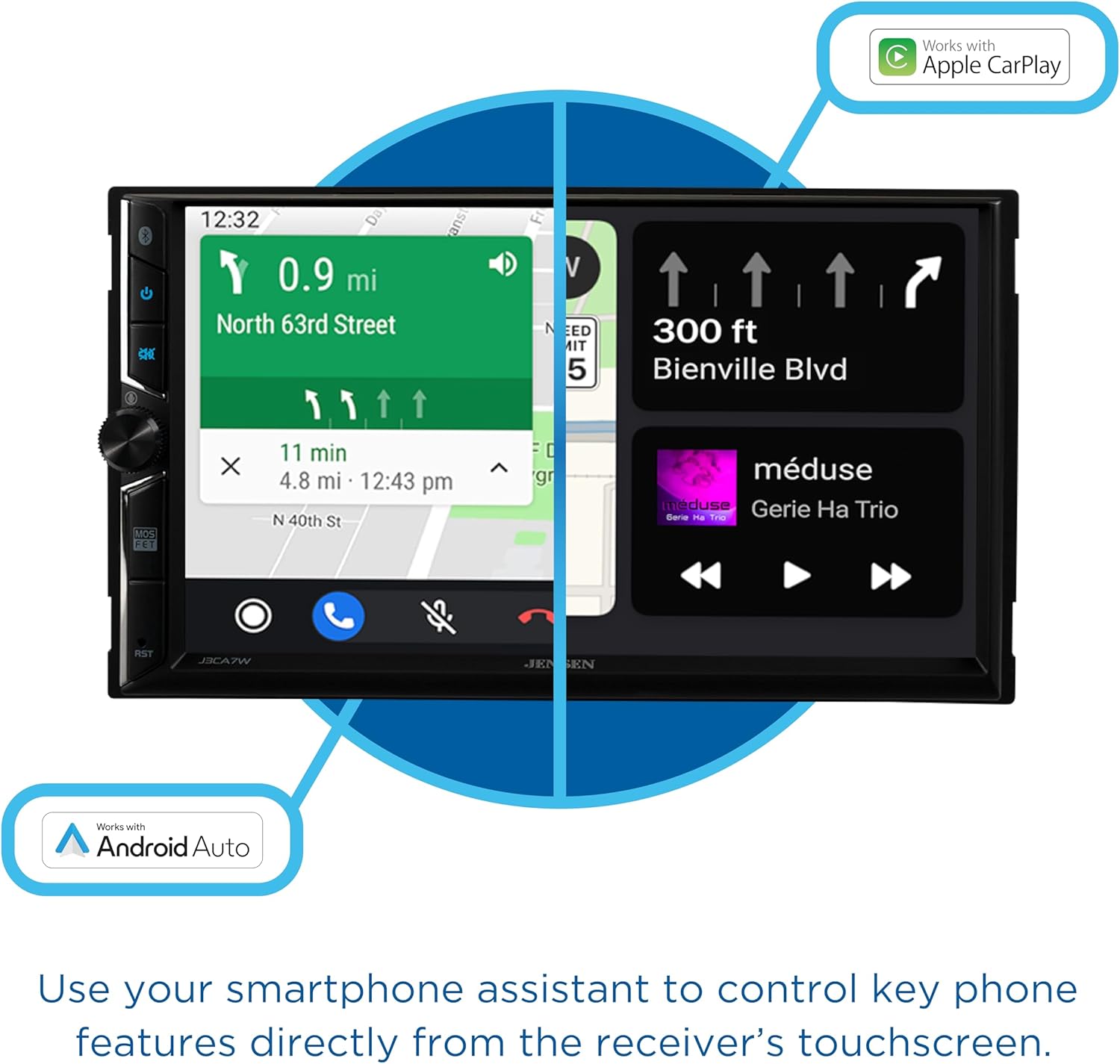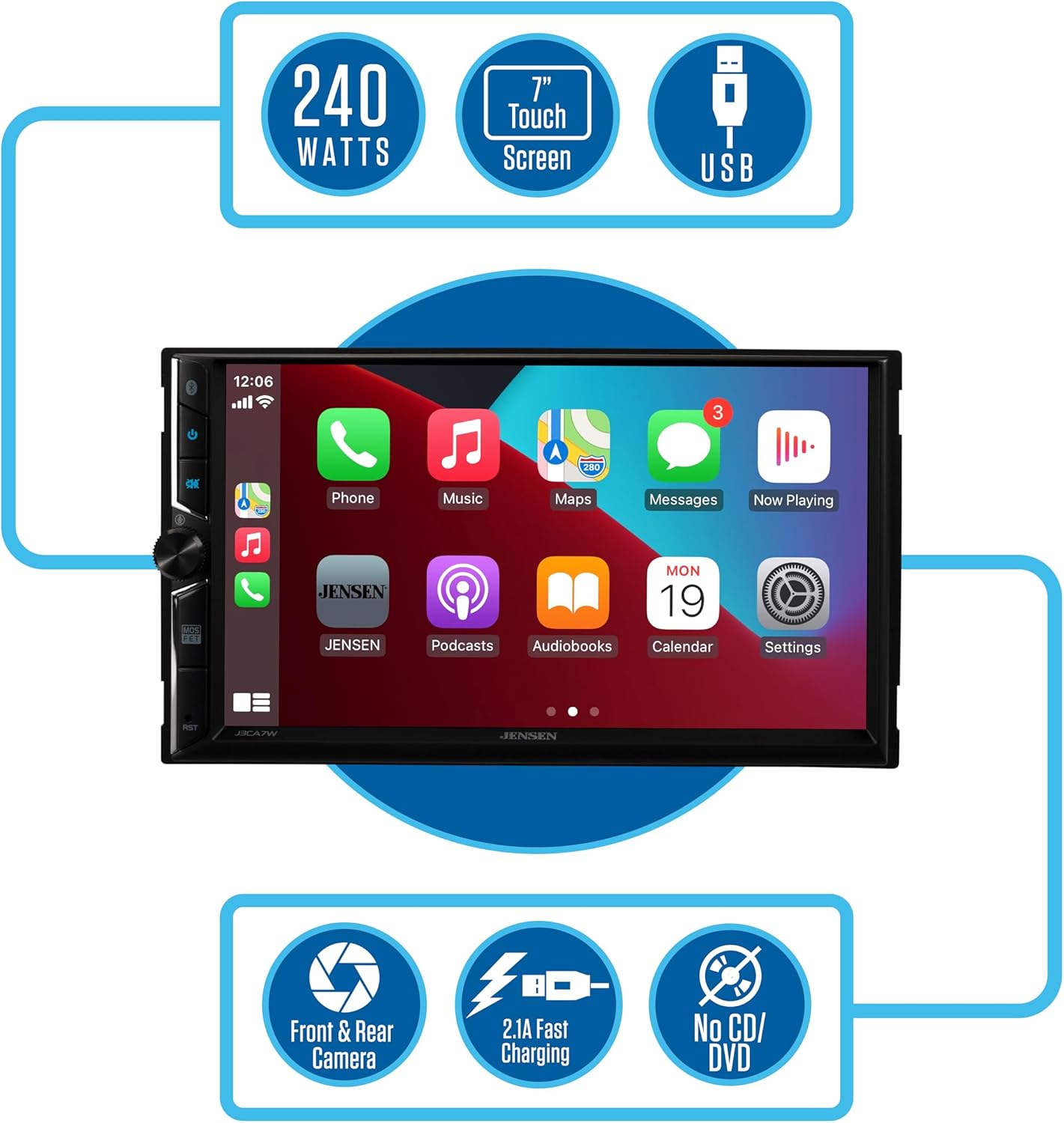 - APPLE CARPLAY – CarPlay is the smarter and safer in-vehicle interface to operate your iPhone, and the experience is taken to another level when featured in the J3CA7W multimedia receiver. Simply talk to Siri or touch the receiver’s display and get directions from Apple Maps, make phone calls, listen to voicemail, send and receive texts, and listen to music all in a way that allows you to stay focused on the road.