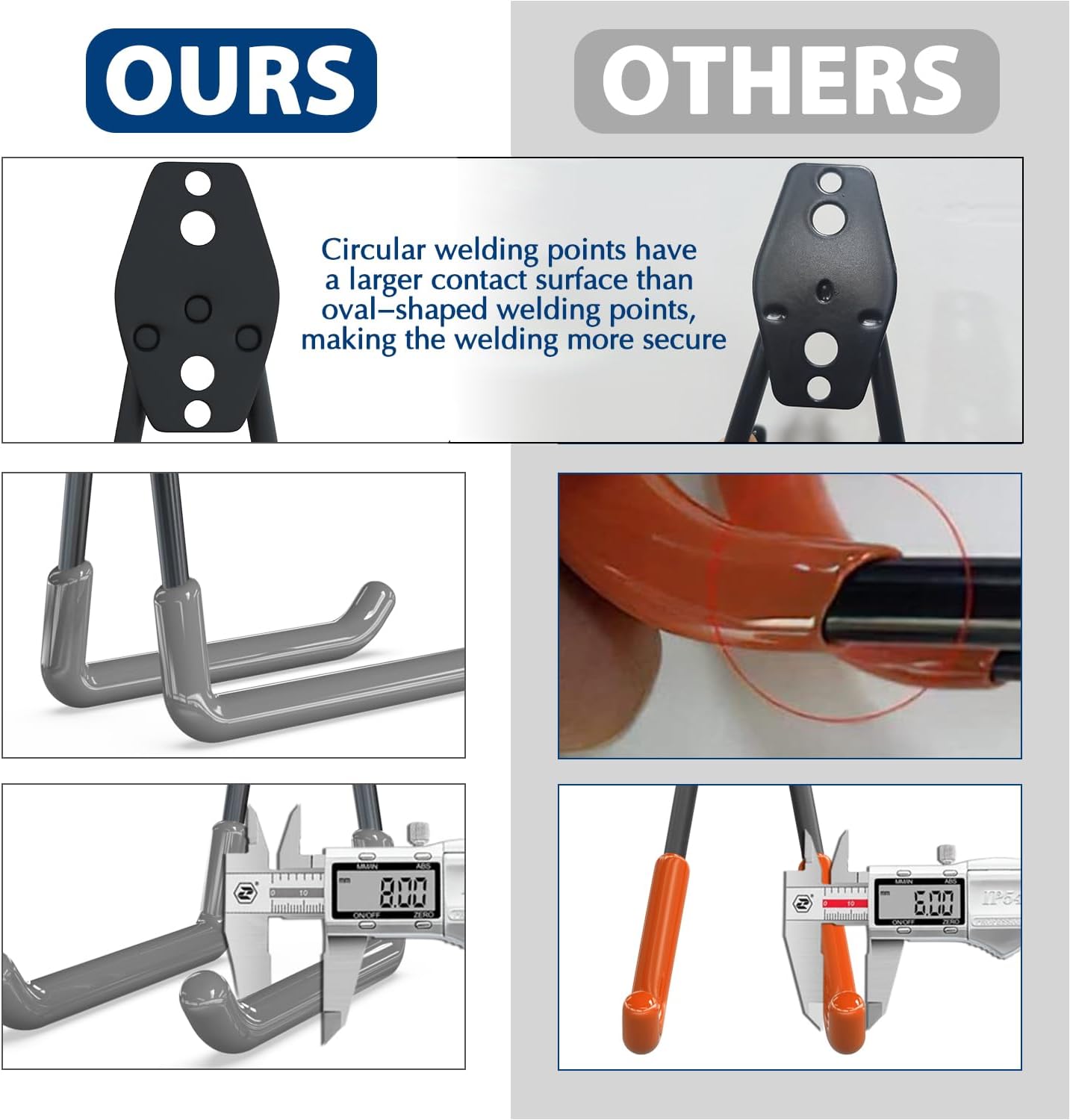 - Upgrade Design for Garage Storage Hooks: Different from other similar garage hooks heavy duty with oval-shaped welding points, our designed circular welding points. These provide a larger contact surface between the hook and the backboard, offering higher security. With this design, there’s no need to worry about the rear steel panel splitting or falling off, a perfect choice of wall hooks for hanging heavy duty