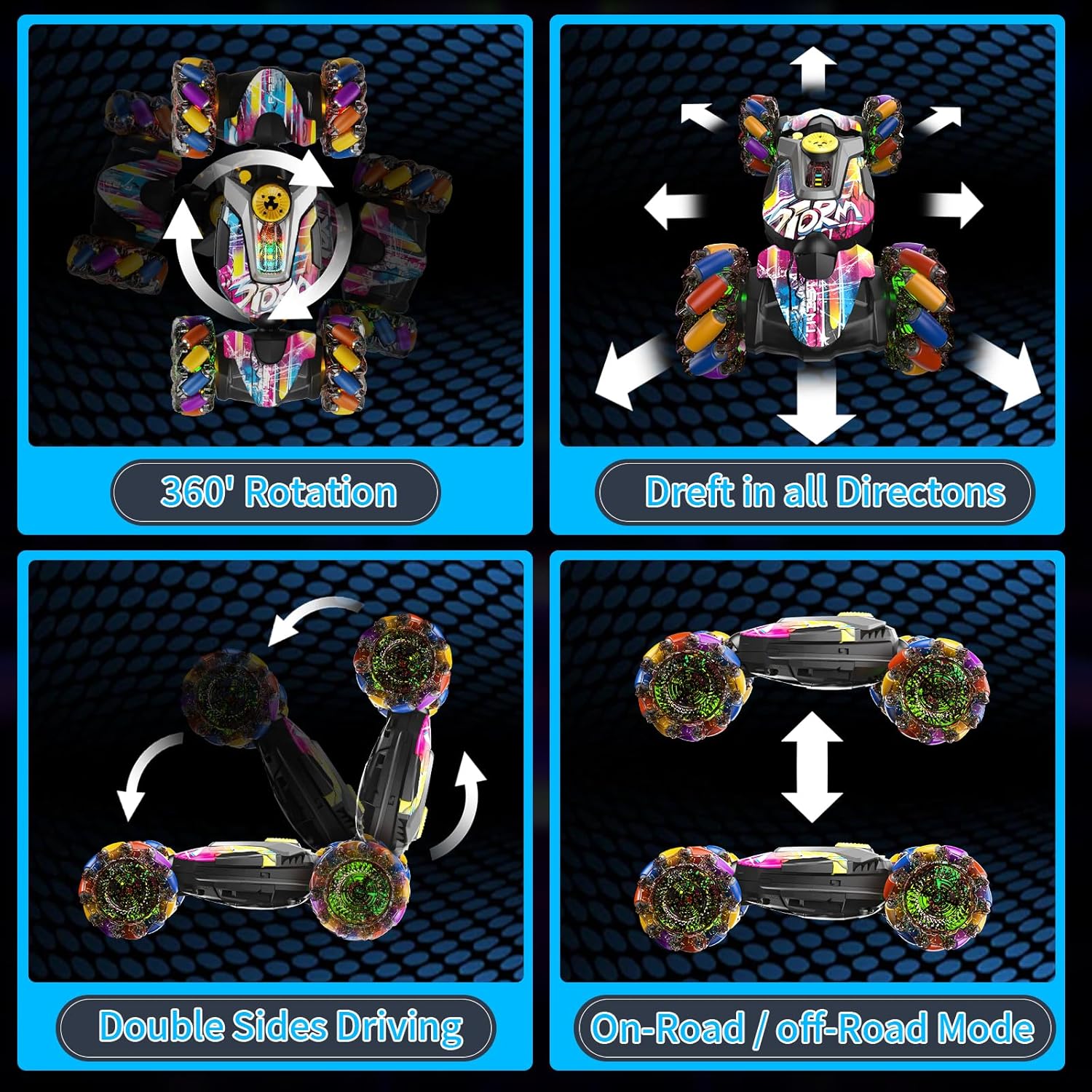 - 360°-Multiple Stunts:awesome stunts such as Drifting all direction, moving sideways and revolving 360° Forward/backward,turn right/left, right/left drift, extreme 360 rolling, double-sided 4WD driving, transform mode,Whether playing indoors or outdoors, remote car are thrilling way for kids to explore physics and mechanics,will keep them captivated for hours,Very cool kids toys boys 6-8-12