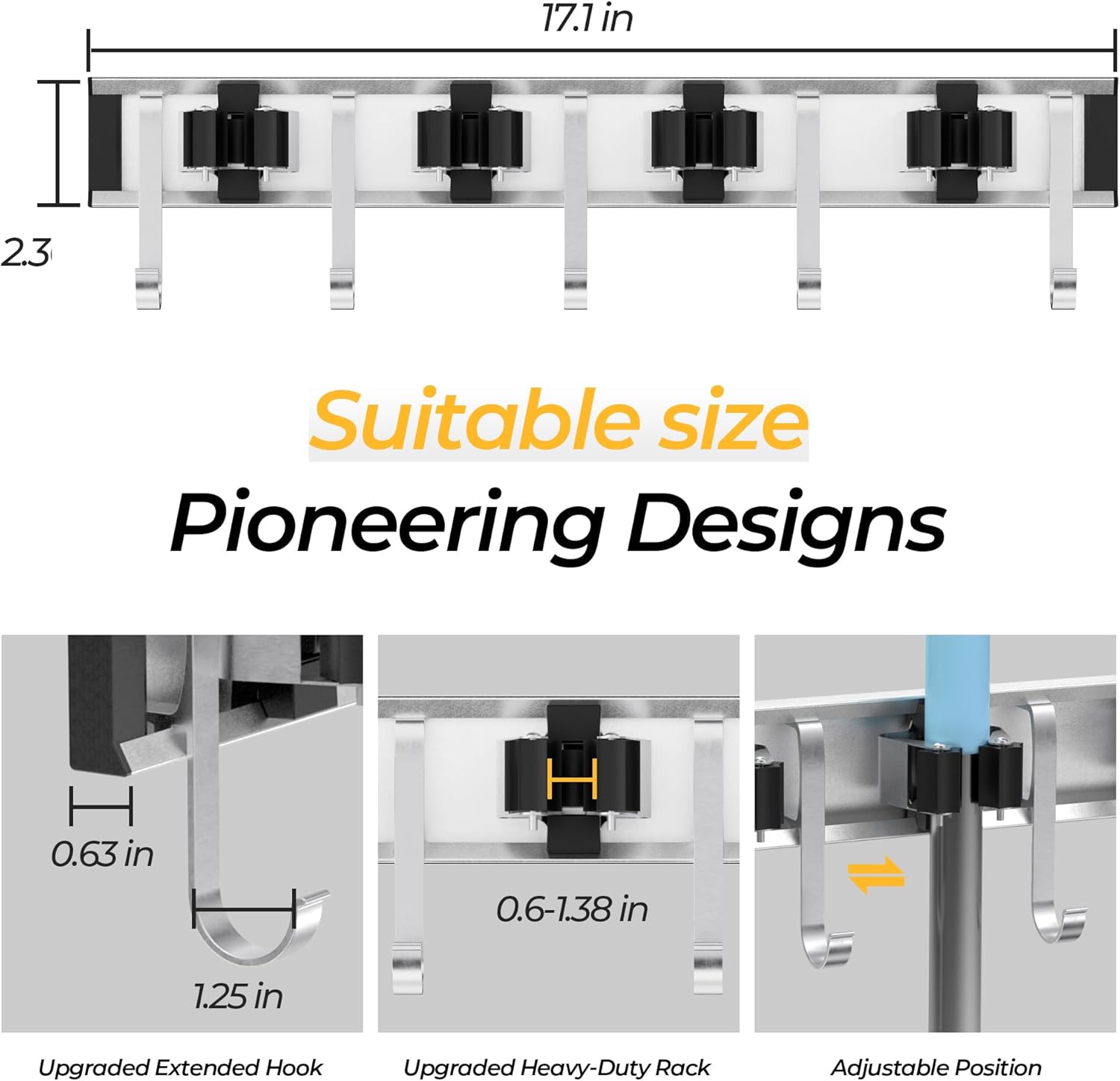 - [Star wheel Design] Four high precision star wheel clamps automatically adapt to 0.7 to 1.4 inch handle diameters, delivering a secure slip free grip perfect for any broom holder application—no more slipping tools.