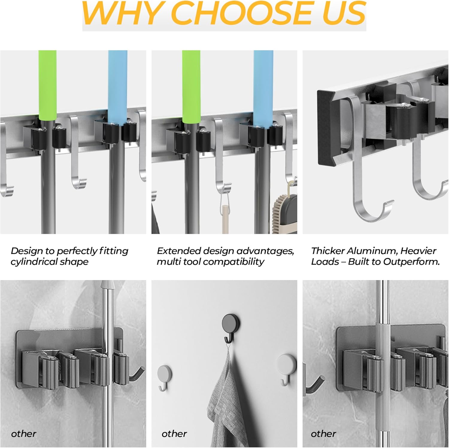 - [Premium Materials and 55 lbs Capacity] Clamps are made of rust proof manganese steel while the backplate and hooks are crafted from thickened aluminum alloy. Weather and corrosion resistant, this unit doubles as a durable mop holder and supports up to 55 lbs of heavy duty tools.