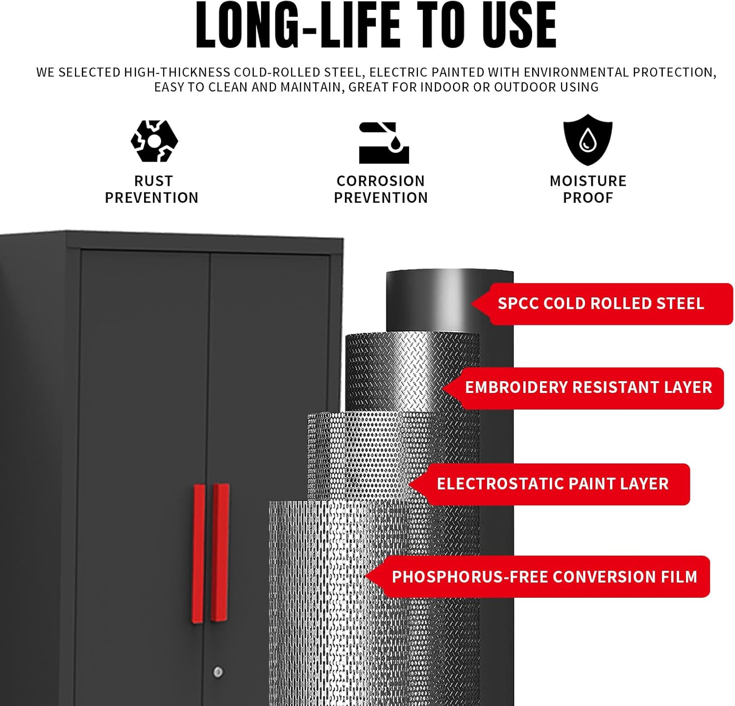 - Heavy Metal Structure: Heavy metal cabinets with furniture locks are made of 100% cold rolled steel and forged with a thickness of 0.8mm. Cabinets are of all-welded construction. The reinforced structure makes the black metal cabinets with locks safer, stronger, and more durable. The black garage tool cabinet also adopts a newly developed coating, which has strong wear resistance and extends its service life.