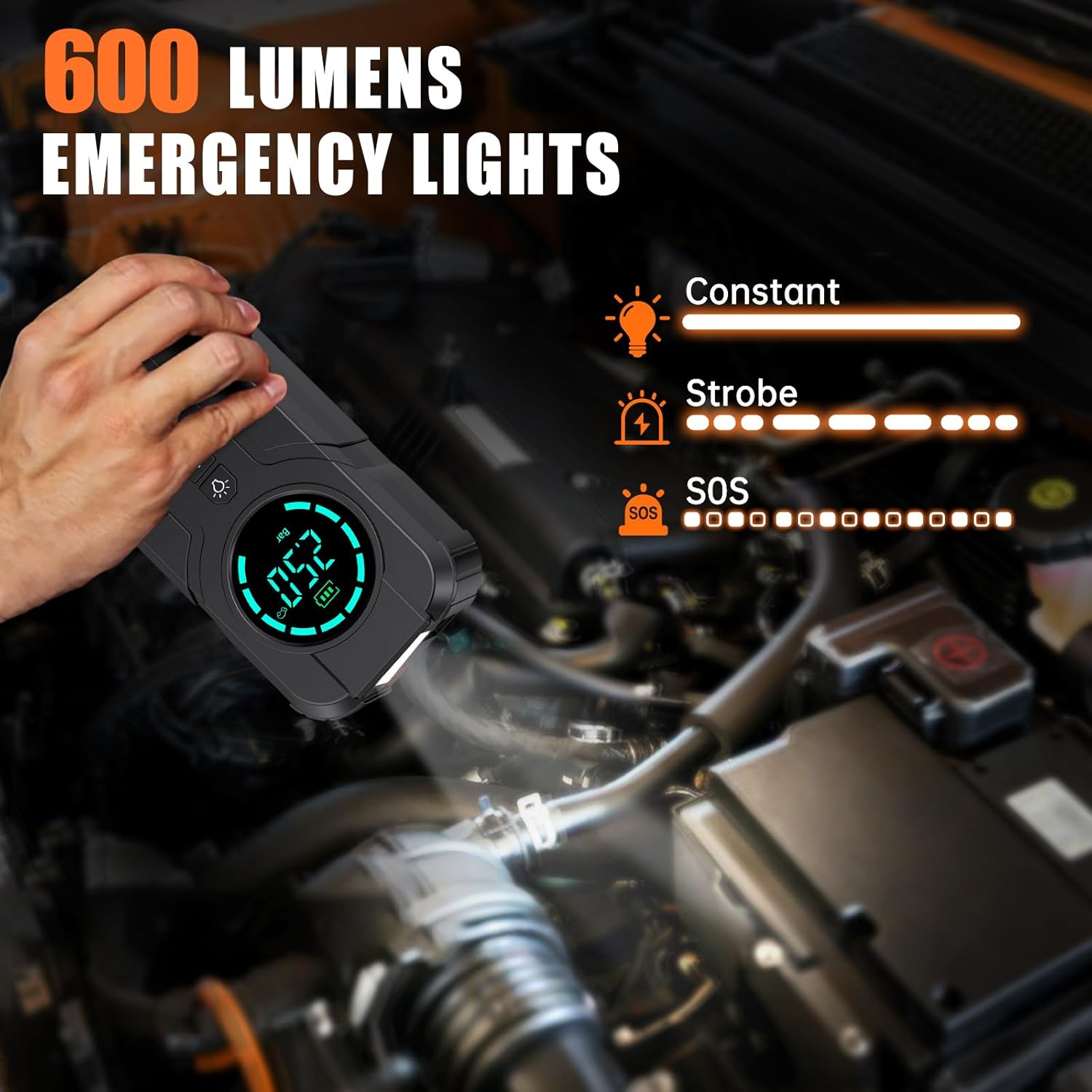 - ➤【Fast Tire Inflation and LCD Screen】This Car Jump Starter features a clear, easy-to-read LCD screen and delivers up to 150 PSI. Equipped with 4 multi-function nozzles, it's perfect for cars, motorcycles, bikes and sports equipment. Keeps you ready for any tire emergency. Press the jump starter light button can switch 3 LED light modes (Flashlight, SOS, Strobe), perfect for nighttime emergencies, also dual Type-C ports for charging mobile devices.