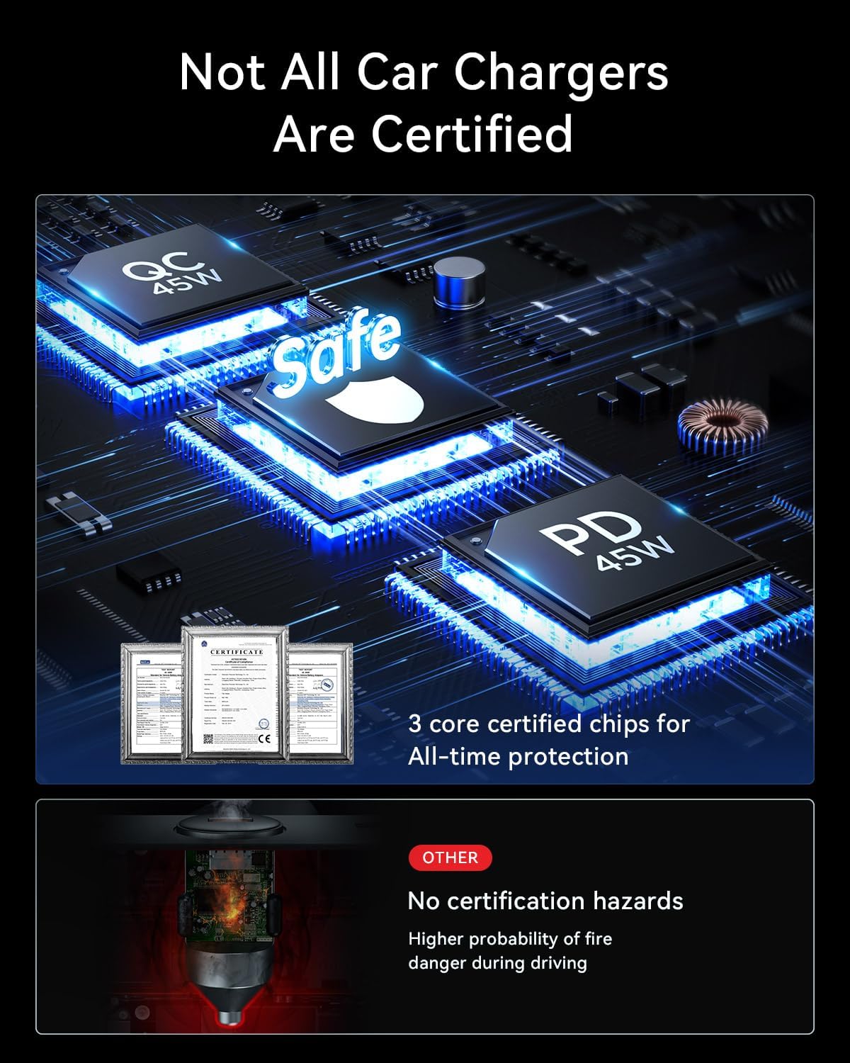 - EXCELLENT HEAT DISSIPATION AND SAFETY: Compared with common plastic, the MRGLAS 90W car charger is made of all metal, which provides better heat dissipation, scratch resistance and beautiful design.MRGLAS USB c car charger passes multiple safety certificates and has built-in dual-core PD45W&QC45W intelligent identification chip, which prevents overcurrent, short circuit, overvoltage, undervoltage, overheat and overpower, protect your device from damage.