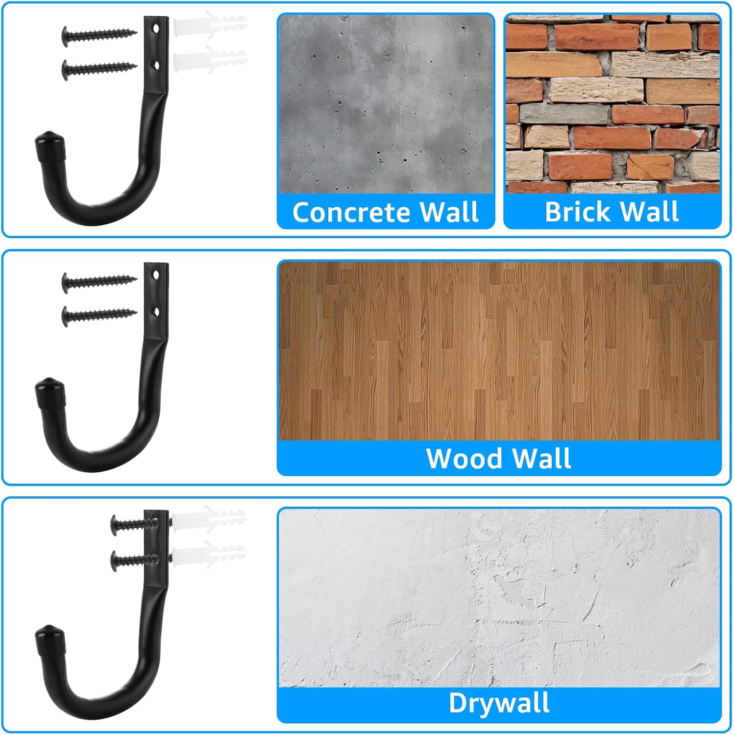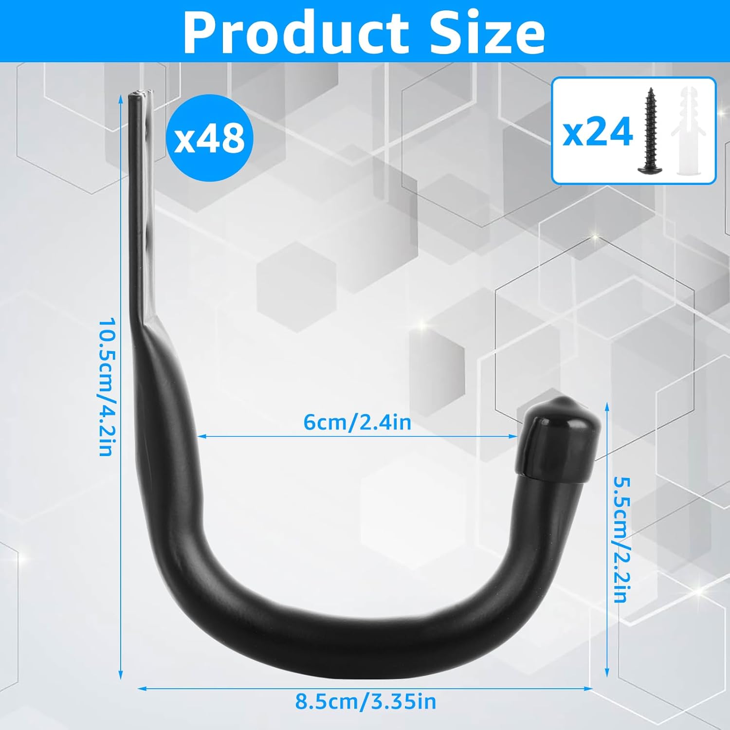 - SPECIFICATIONS:Our garage storage hooks set shipped as 24 pack, 48 wall Anchors, and 48 screws, hook size: 4.2in x 3.35in(L x W).