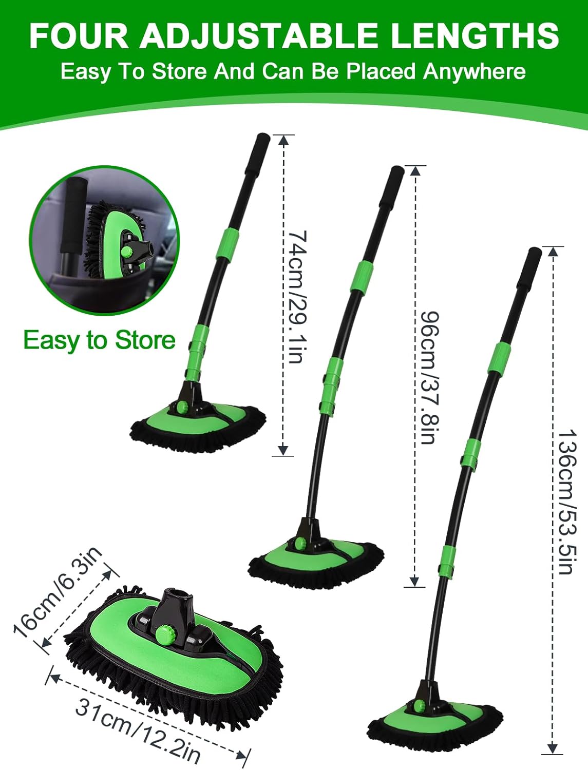 - 15°CURVED DESIGN: The 4-section long handled brush pole adopts 15°Curved Design. 151CM/53” 4-section brush pole can extension adjusted at will. You don’t need to raise your hands or bend over for a long time when washing the car. You can easily clean the roof and hard clean corners, making car washing more