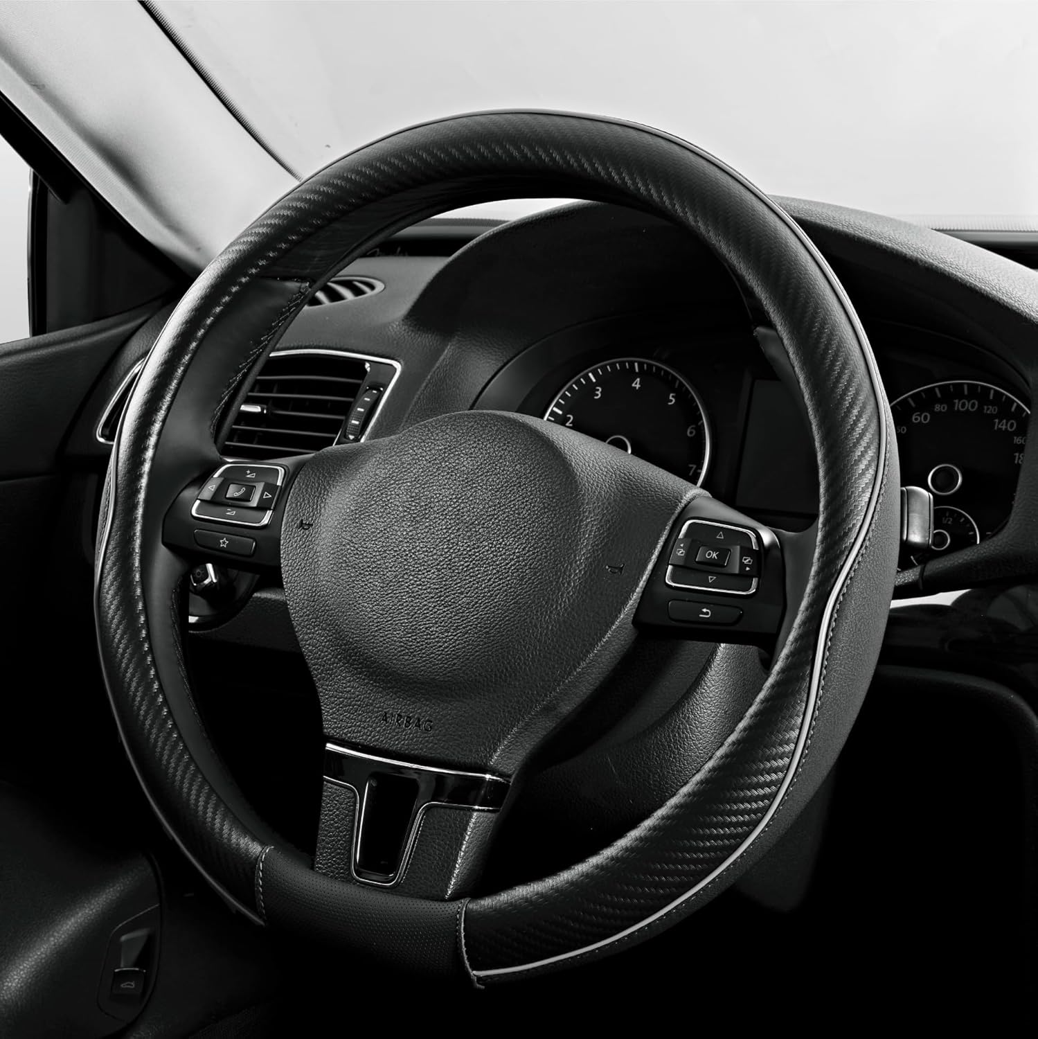 - MATERIAL - High-quality leather with sports carbon fiber accents, providing a sleek, luxurious feel while also being durable and long-lasting. The carbon fiber details add a touch of sportiness, elevating the overall look of your vehicle's interior. This steering wheel cover combines both style and practicality.