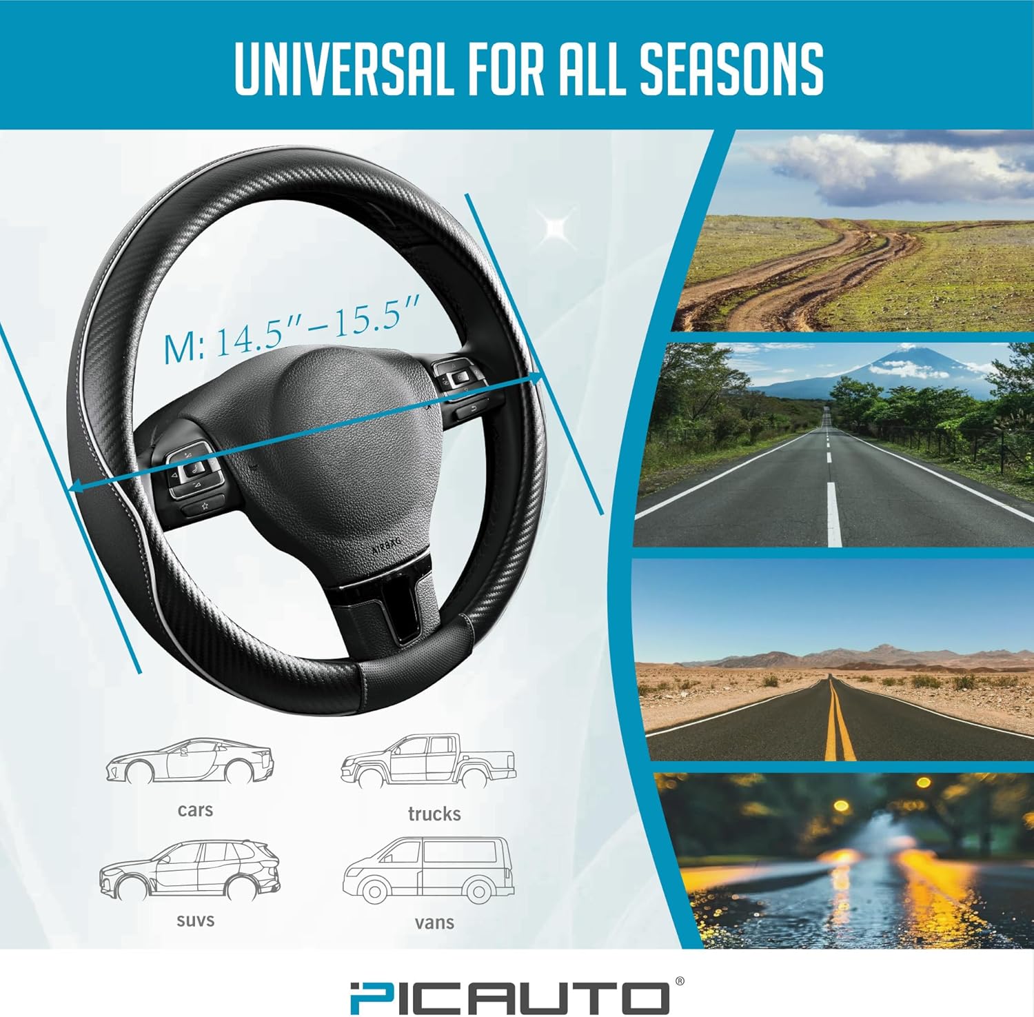 PIC AUTO Steering Wheel Cover, Gray Piping Leather, Sports Carbon Fiber and Super Breathable Leather, Universal 14.5-15.5 Inch Anti-Slip Steering Wheels Accessories for Men & Women