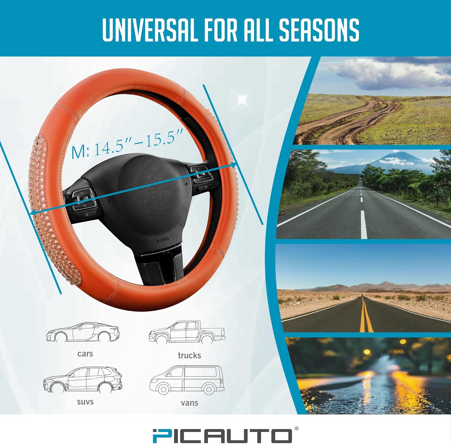 PIC AUTO Gel Particles Steering Wheel Cover, Orange Luxury Leather Car Steering Wheel Protector, Universal Fit 14.5"-15.5" Anti-Slip Car Interior Accessories for Girls & Women
