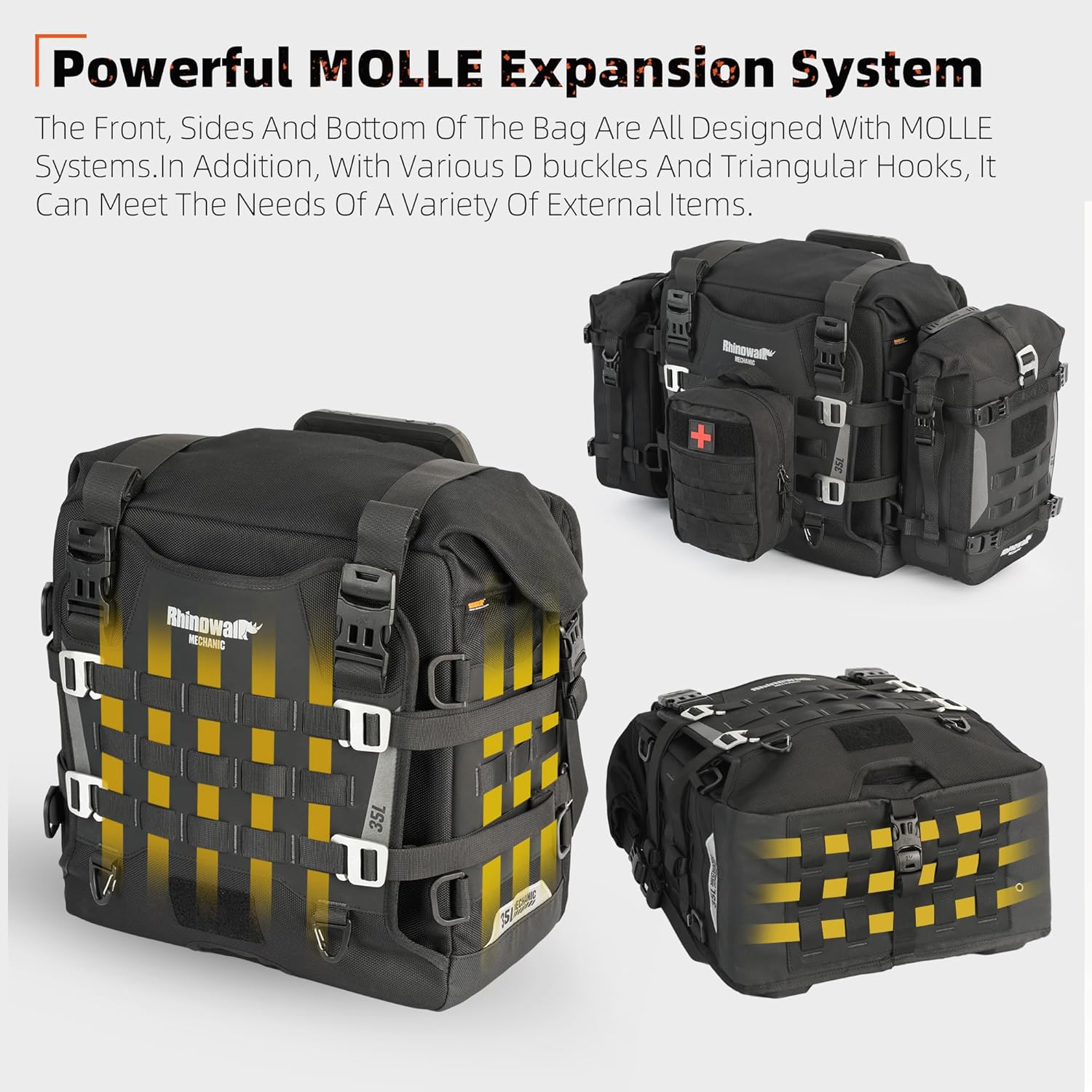 - [Large Capacity] Plenty of storage compartments. The single side bag has a capacity of approximately 35L when folded three times. the front, sides and bottom of the bag are designed with the molle system. The front, sides and bottom of the bag are designed with the molle system. In addition, with various D-shaped buckles and triangular hooks, the bag can be used for a variety of external items. Opening the front panel reveals an abundance of storage space. Exclusive repair tool pocket, electronics organizer and separate waterproof map pocket