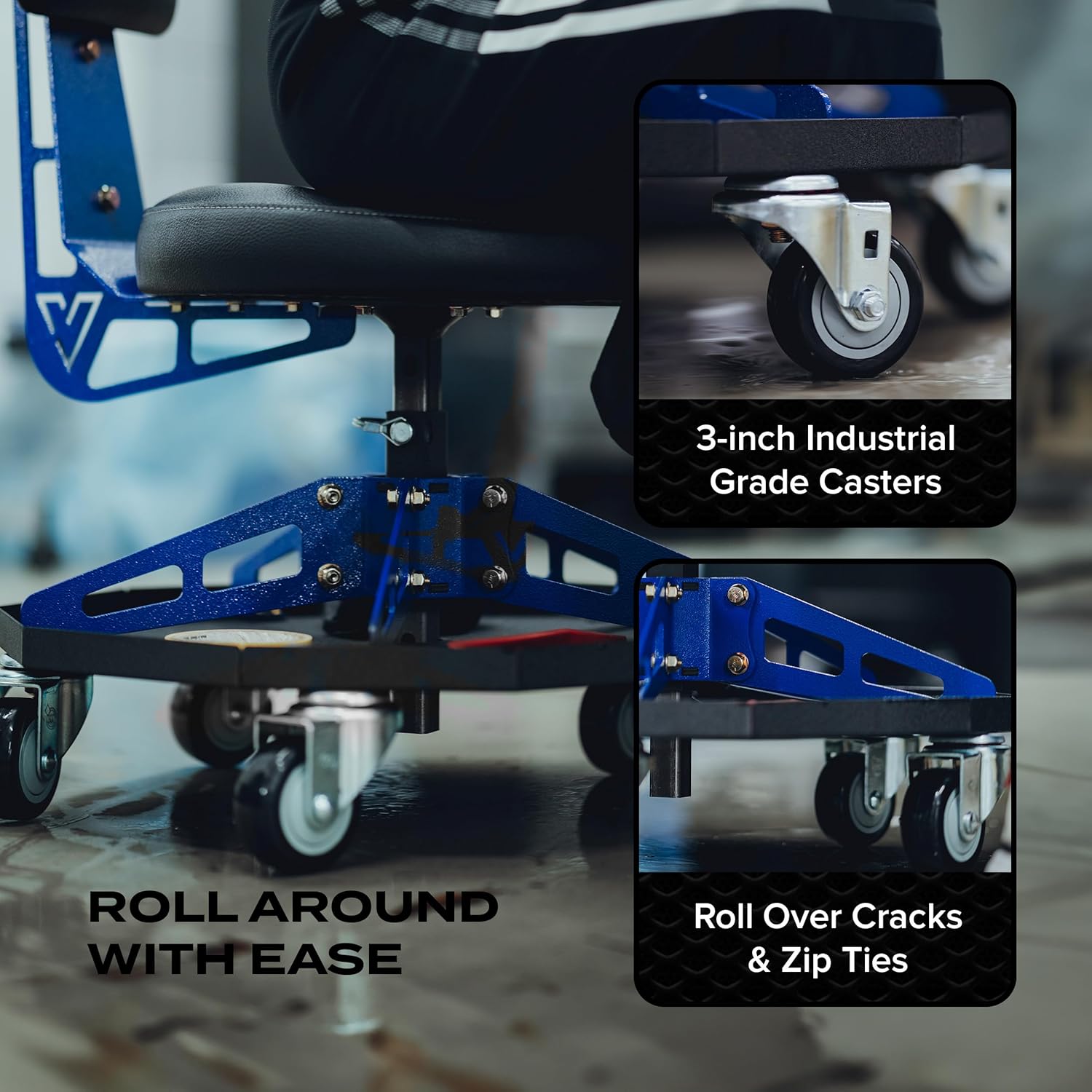 Vyper Robust Steel Sport Shop Chair for Mechanics, Automotive, DIY - 300 lb Capacity Garage Stool with Backrest & Large Wheels (Black Seat, Blue Frame)
