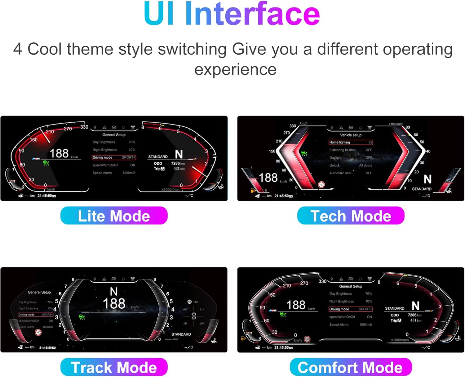 - βοΈ[4 sets of UI styles can be freely switched] This digital cluster features 4 customized modes (simple, comfortable, track, and technology) for the LCD. Additionally, it offers 4 color interfaces (red, purple, blue, and orange) that can be freely changed to enhance your driving comfort. The original vehicle data and information are presented more intuitively.