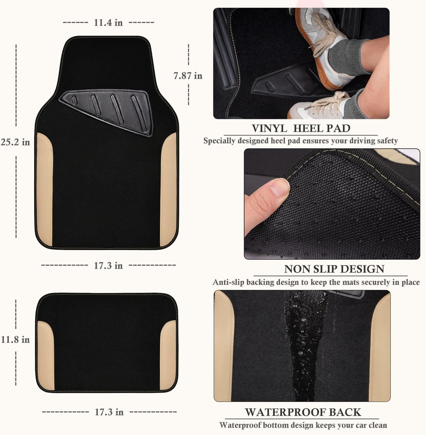 CAR PASS Waterproof Car Floor Mat, Universal Fit Car Mats with Driver Heel Pad, Leather Car Carpet, Anti-Slip Nibbed Backing Floor Mats for SUV, Vans,Sedan,Truck, Automotive Floor Mats (Black Beige)
