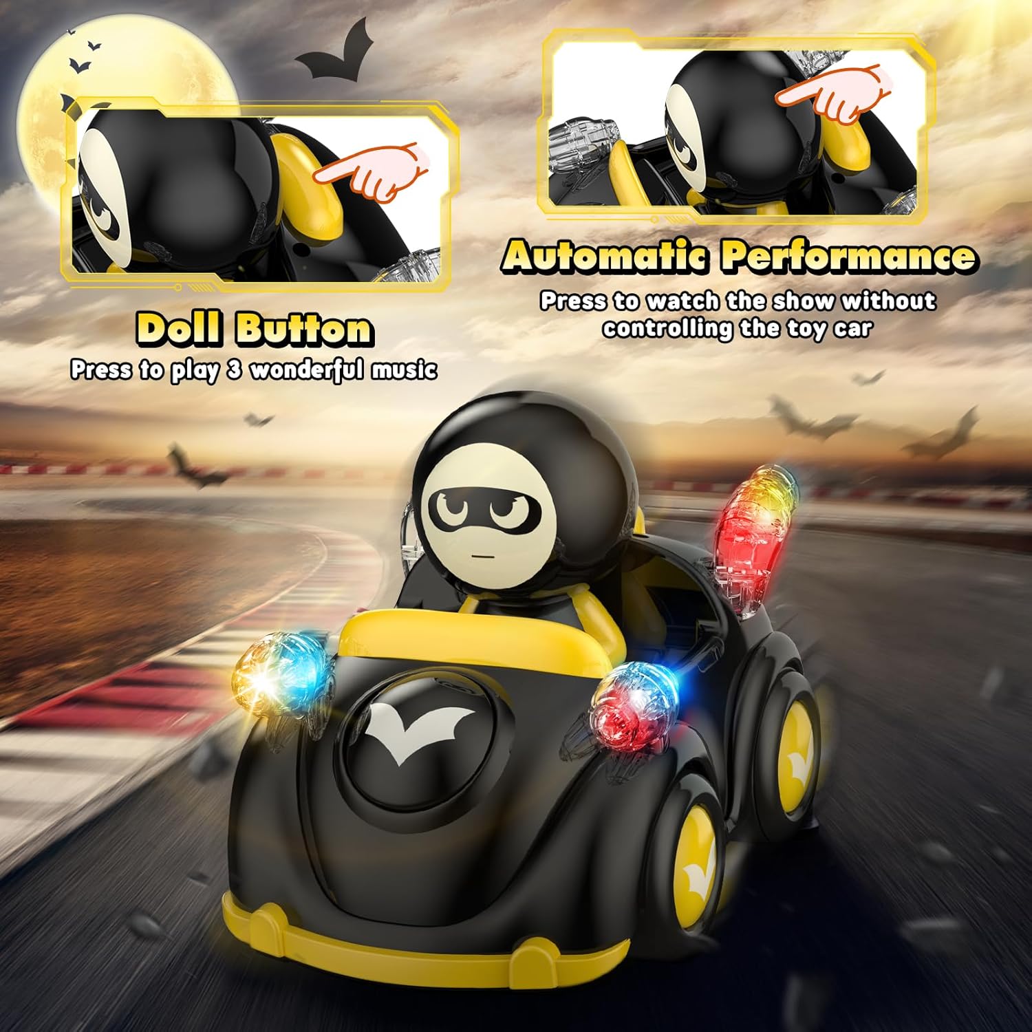 - 【Cute Bat Design with Lights & Music】Designed as a cartoon superhero and equipped with flashing lights and 3 cheerful music, our bat toy car wakes up the kids' curiosity, attracts their attention, and provides hours of joyful play