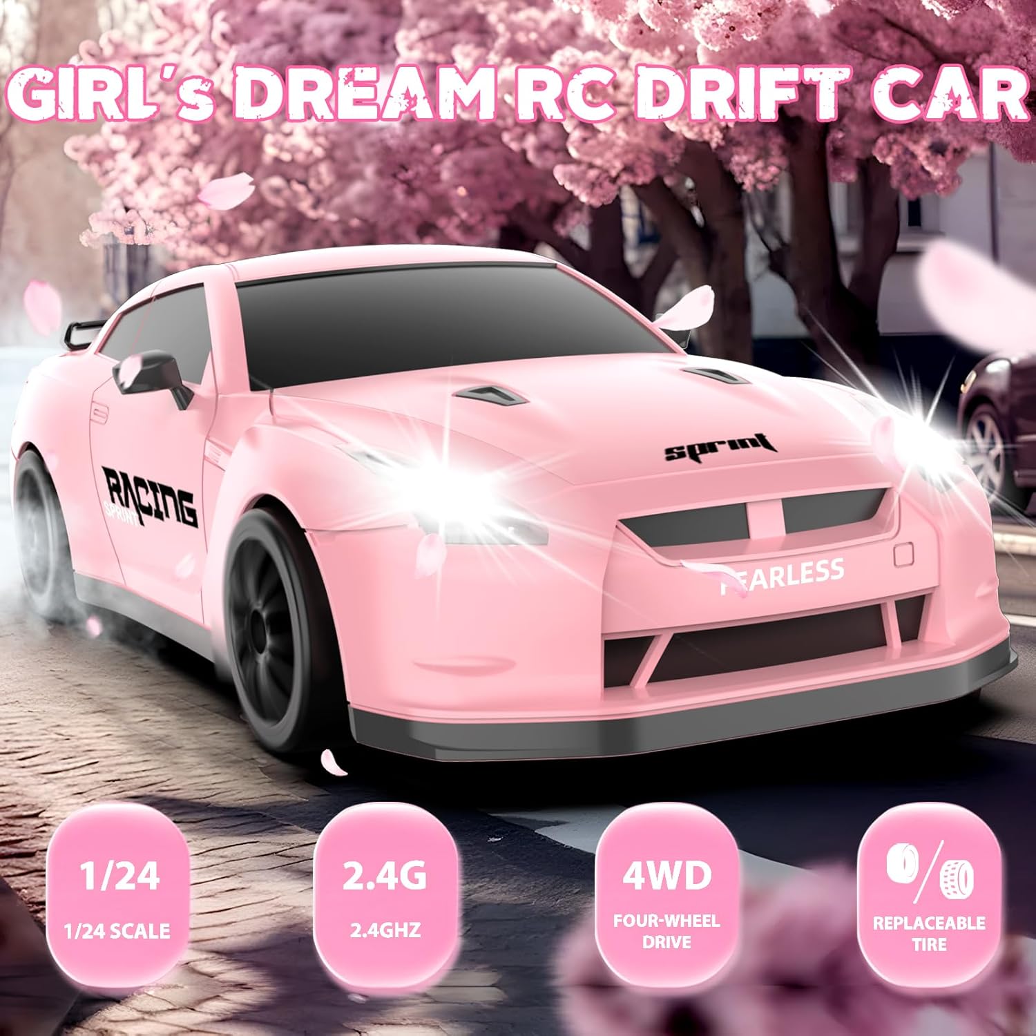 RC Drift Car, 1/24 Pink Remote Control Car for Girls, 2.4GHz 4WD High Speed Drifting RC Cars with LED Light and Drift Tires, Racing Toy Cars for Kids Adults Girl Boys, Pink