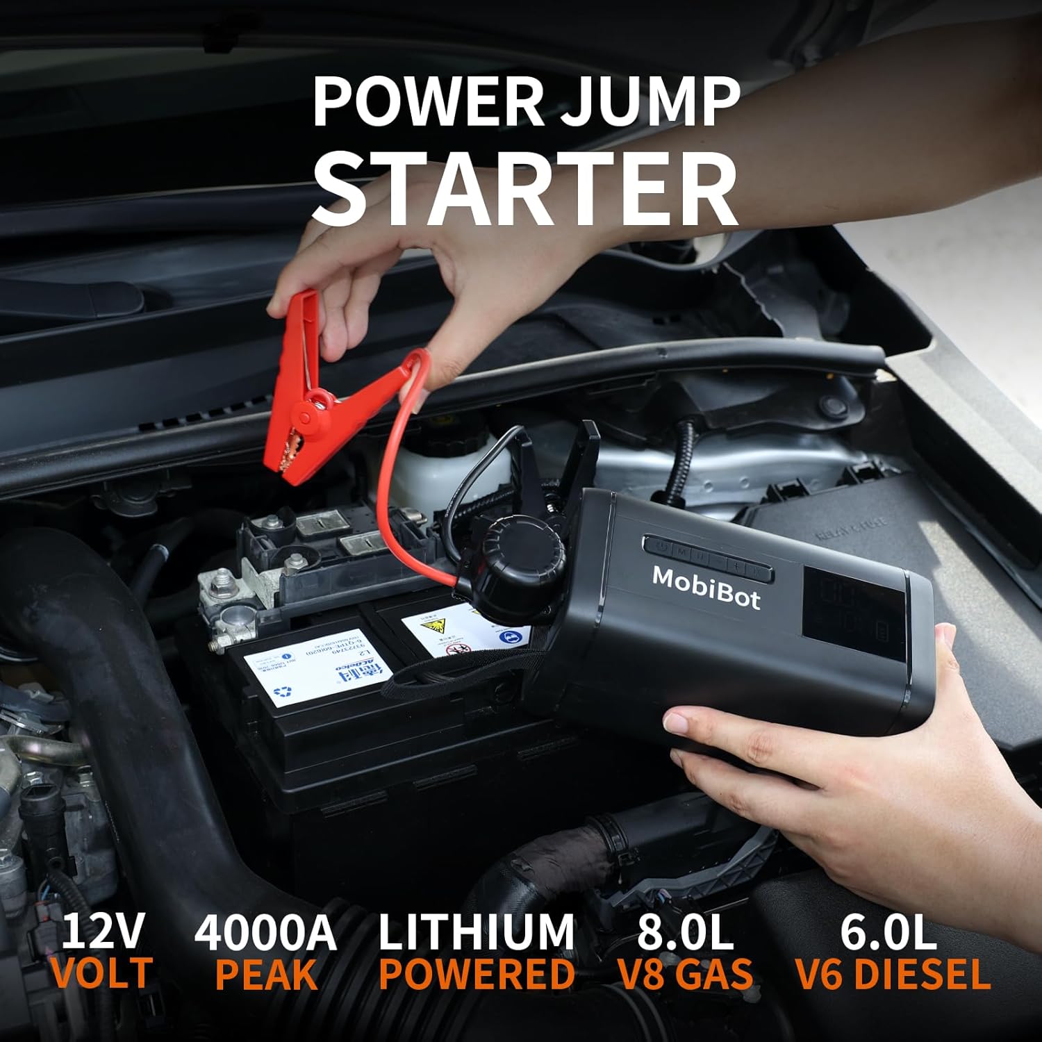 - [High Performance Car Jump Starter] Powerful and safe. With boosted 4000A cranking current, the car battery jump starter battery pack can instantly restart your 12V vehicles (specially for up to 8.0L gas/6.0L diesel) even at -4~140℉, support more than 1000+ recharge cycles. This jump box for car battery standby for about 24 months, always ready to help.
