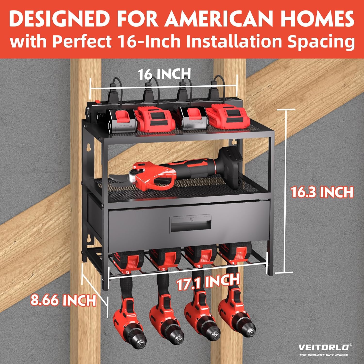 Veitorld Power Tool Organizer with Charging Station, Garage Tool Storage Organizer Built in 8 Outlet Power Strip with Drawers, 6 Drill Holder Wall Mount, Gifts for Men Dad Husband Him Fathers Day