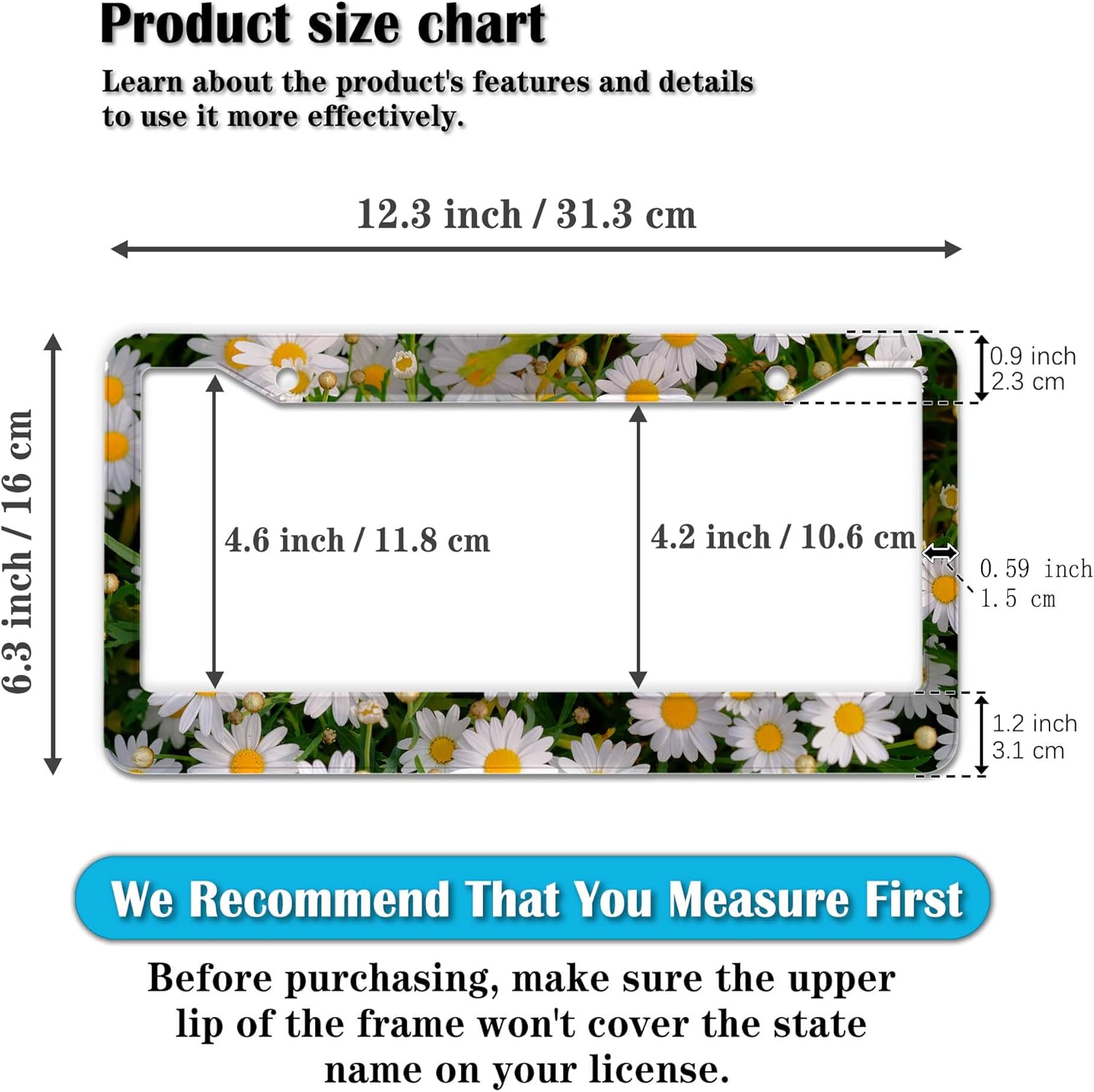 - STANDARD FRAME SIZE: Ensure a perfect fit by checking the dimensions to avoid covering your state name. These frames are specifically designed to fit standard American license plates measuring approximately 12.3" x 6.3" (16 x 31 cm). for most license plates in the U.S.