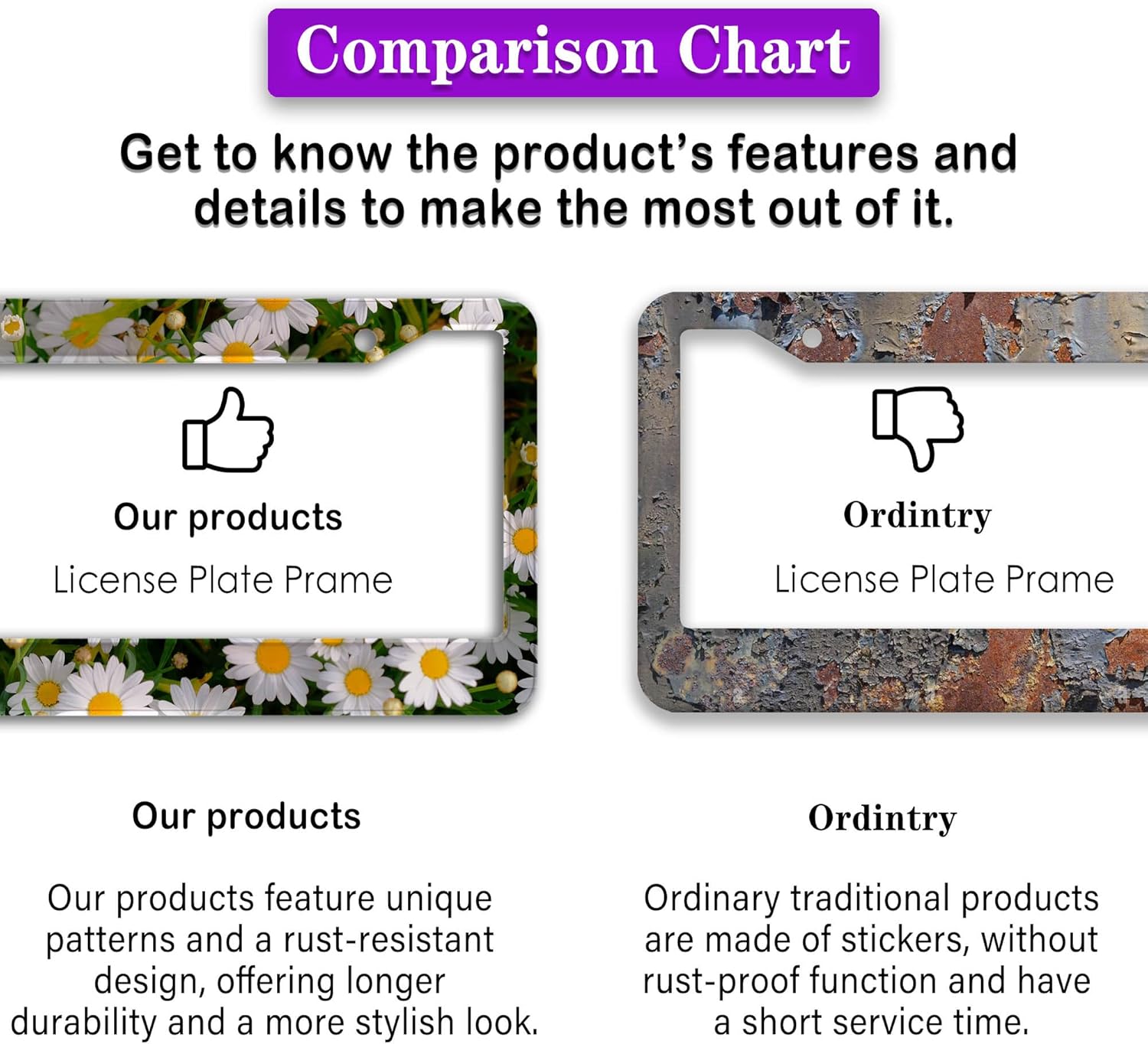 - ALUMINUM FRAME: This License Plate Frame is crafted from high-quality aluminum that is resistant to corrosion, rust, and harsh weather conditions. Its rugged reliability design ensures a long lifespan, making it capable of withstanding car washes and extreme weather, providing you with a reliable and stylish solution for your vehicle.