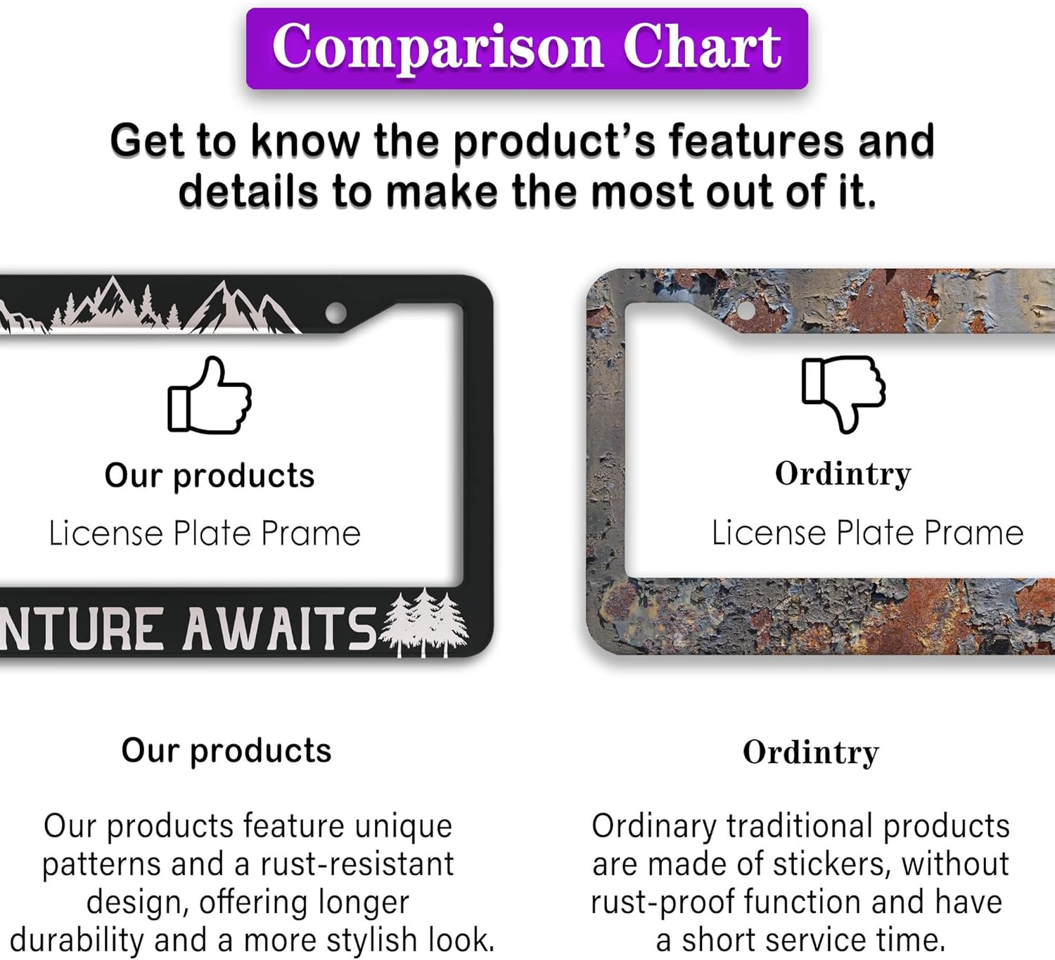 - ALUMINUM FRAME: This License Plate Frame is crafted from high-quality aluminum that is resistant to corrosion, rust, and harsh weather conditions. Its rugged reliability design ensures a long lifespan, making it capable of withstanding car washes and extreme weather, providing you with a reliable and stylish solution for your vehicle.