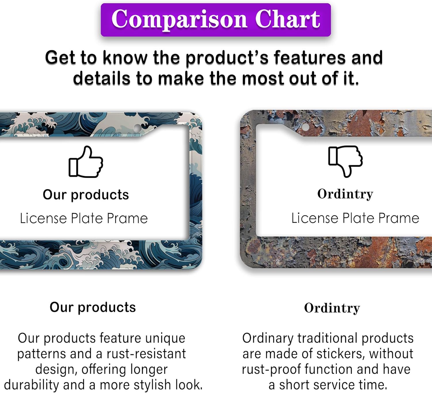 - ALUMINUM FRAME: This License Plate Frame is crafted from high-quality aluminum that is resistant to corrosion, rust, and harsh weather conditions. Its rugged reliability design ensures a long lifespan, making it capable of withstanding car washes and extreme weather, providing you with a reliable and stylish solution for your vehicle.
