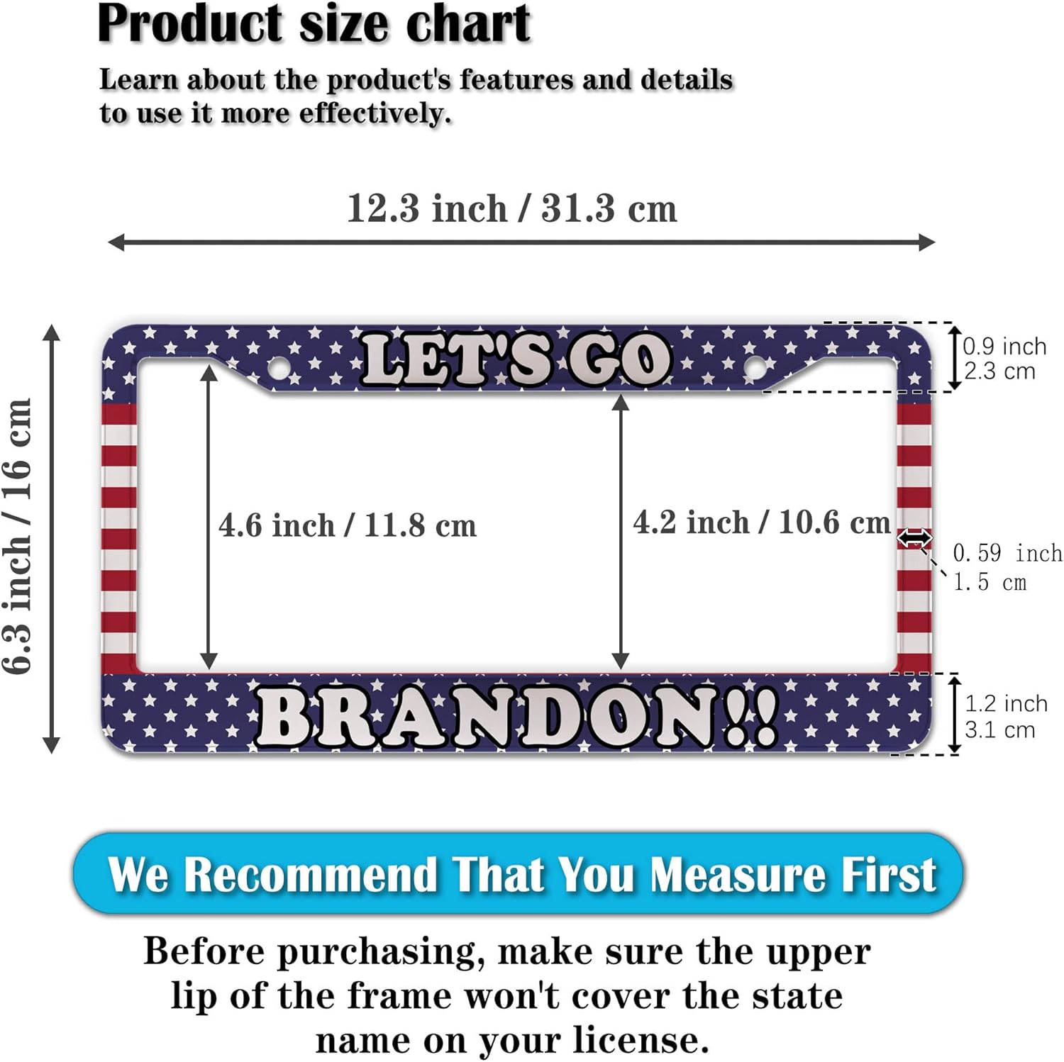 - STANDARD FRAME SIZE: Ensure a perfect fit by checking the dimensions to avoid covering your state name. These frames are specifically designed to fit standard American license plates measuring approximately 12.3" x 6.3" (16 x 31 cm). for most license plates in the U.S.