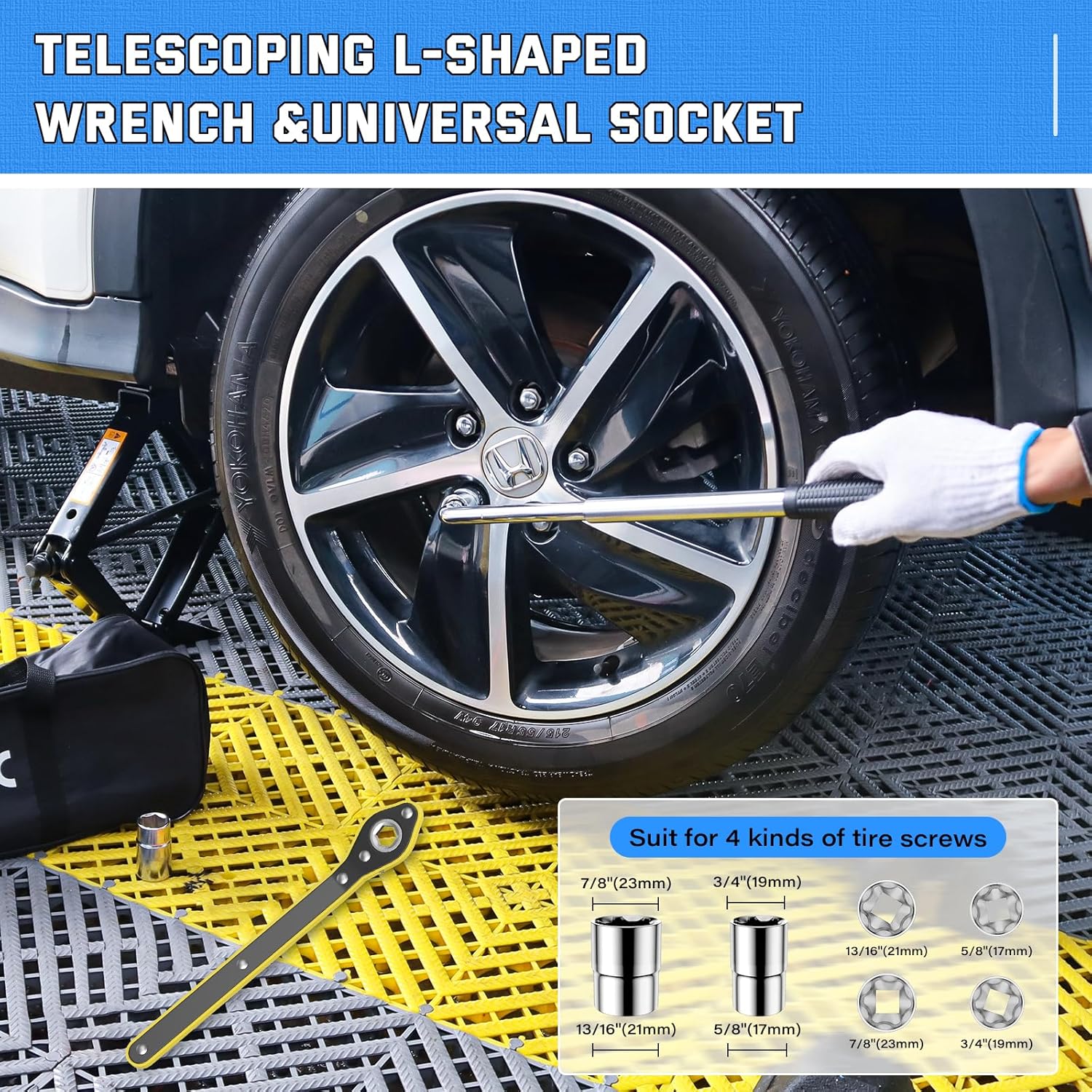 - 【Easy to Operate】The Tire Jack has a simple and easy-to-operate design, while the lug wrench and tire changing kit are designed to provide a comfortable grip and maximum leverage.this car jack kit is a must-have for any roadside emergency tire change.