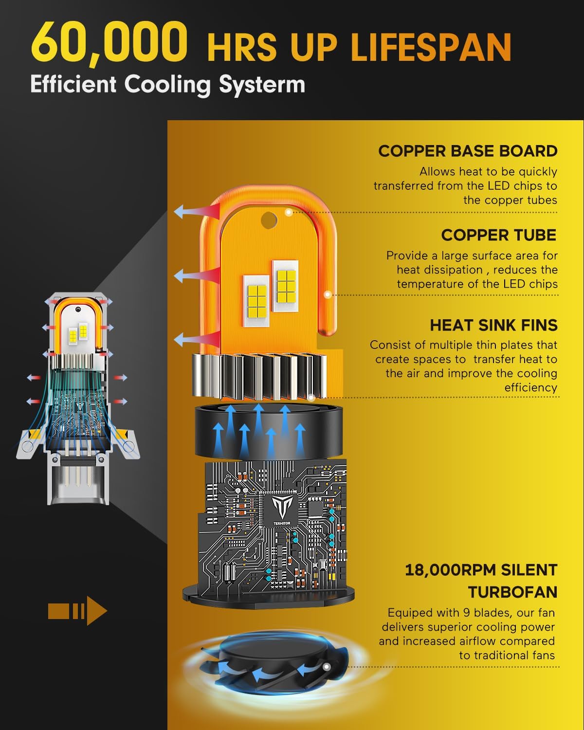 - 【Over 60,000-hours Lifespan】Take premium aviation aluminum as the main body, double copper base tube provide a large surface area for heat dissipation. The Heat Sink Fins and 1,8000RPM high speed cooling fan with 9-blade improve the cooling efficiency. This H13/9008 bulbs can ensure a life span up to more than 60,000 hours continuous lighting and stable working. Say goodbye to frequent replacement.