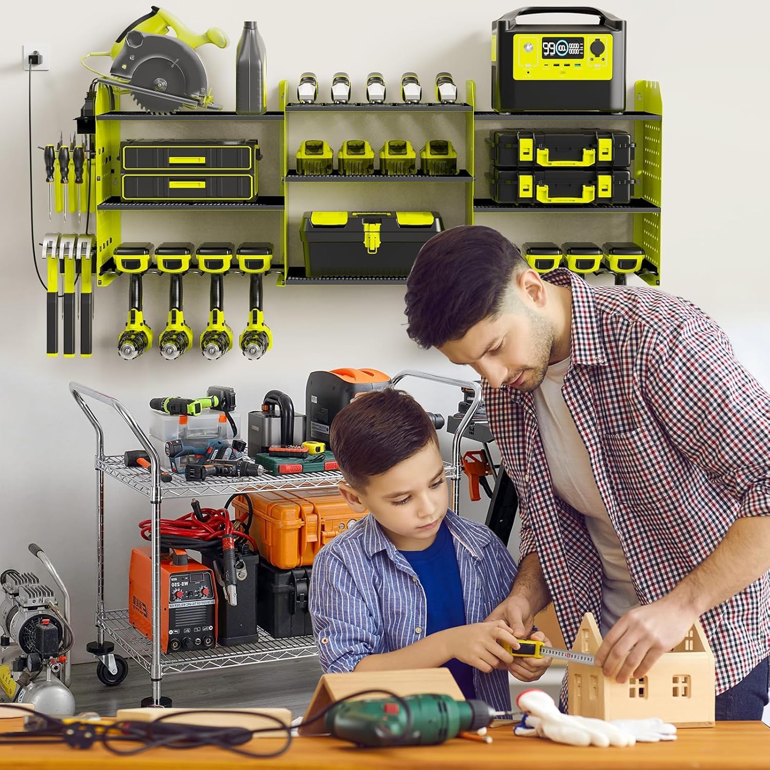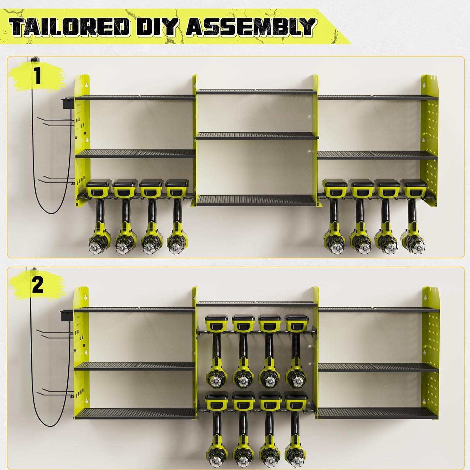- Power Tool Organizer with Charging Station: Position outlets on either side to keep your tools charged. The American-standard power strip (Output: 125V/12A/1500W) provides device protection, frees up top-shelf space, and clearly displays power status. Includes a 6.56 ft power cord for easy setup