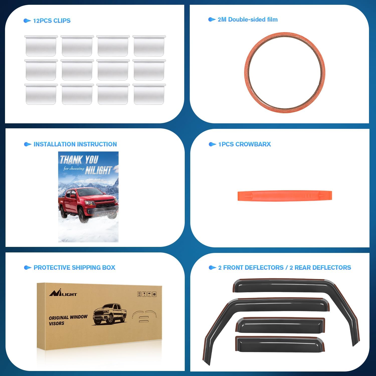 - PACKAGE INCLUDED:4 PCS Rain Guards,12pcs clips,Crowbar 1pcs,78inch double-sided tape and installation instruction