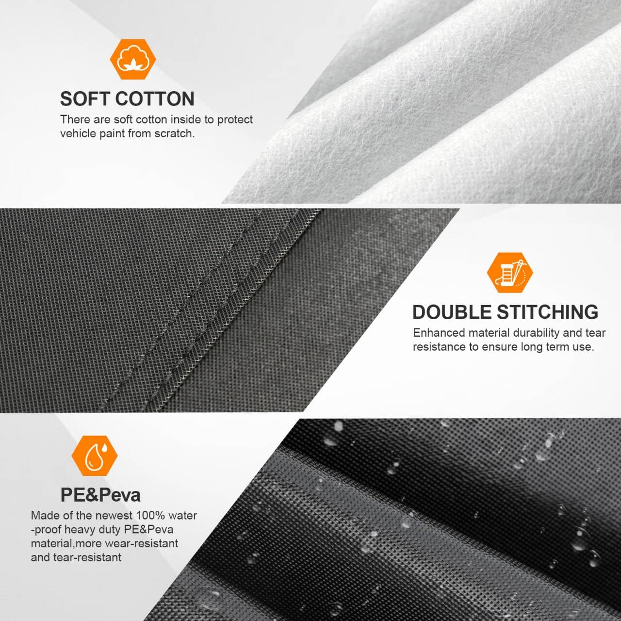 - 【Enhanced Material Protection】Featuring the latest thickened material design: 1. Waterproof and wear-resistant exterior coating; 2. Reinforced tear-resistant synthetic fabric; 3. Soft and breathable cotton lining. Ensures all-weather protection, durability, and aging resistance for the car cover, while safeguarding your vehicle's paint from scratches and abrasion.