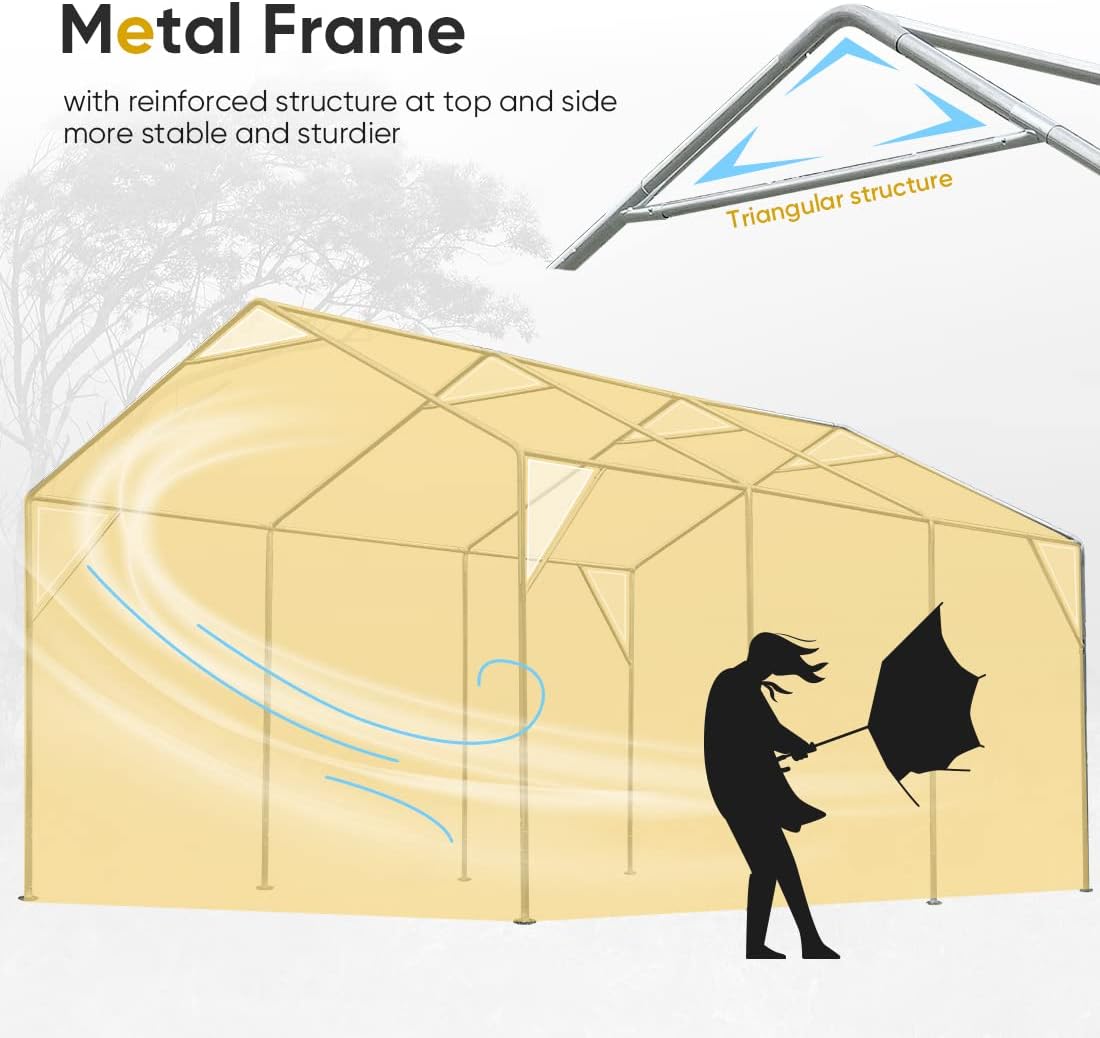 - 【Heavy Duty Metal Frame】- This carport shelter is reinforced by 8 triangle structures, and consists of 1.5-inch diameter galvanized steel poles, 1.3 mm thick and 1.65-inch diameter connectors, 8 sturdy windproof ropes, 4 sandbags, 16 big steel pegs, and 8 auger anchors, to make the whole steel carport much safer and more stable.