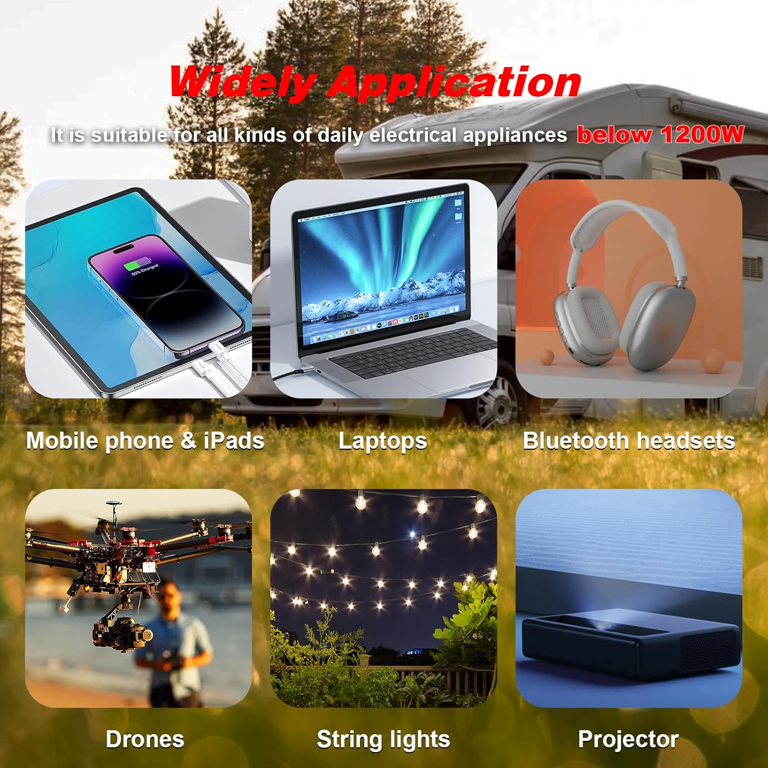 - POWERFUL OUTPUT: Convert power of DC 12V to AC 110V/120V 60Hz. Provides 1200 Watts continuous modified sine wave power and 2400 Watts peak power. Featuring 2 AC outlets and 2 USB ports( QC 3.0 and PD 20W ) for multi-purpose charging. Great High efficiency: conversion efficiency > 90%.