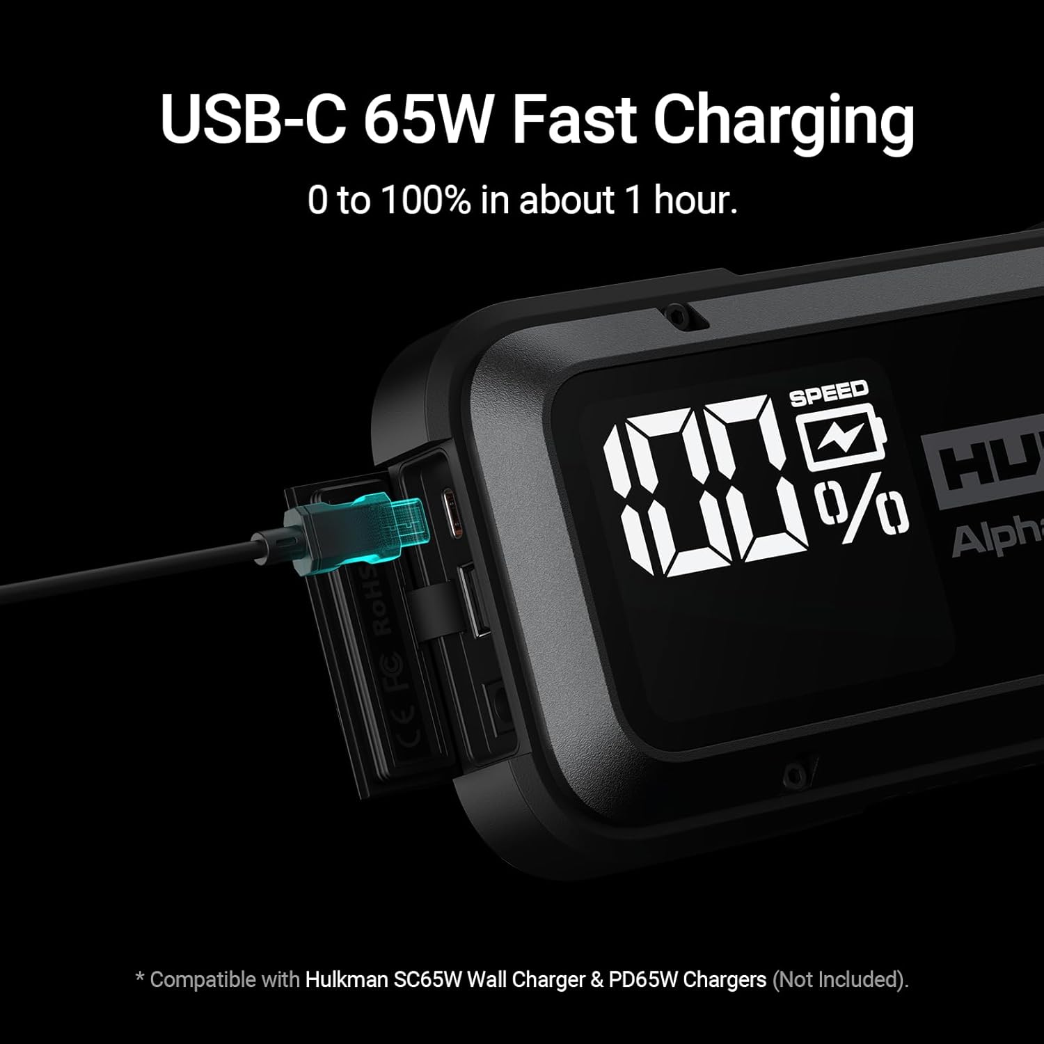 - [What's in the Box] Everything you need: jump starter, clamps, DC adapter, USB-C cable, and manual. A ready-to-go car jump starter kit with 2 years of support. Note: The Hulkman 65W Wall Charger is sold separately.