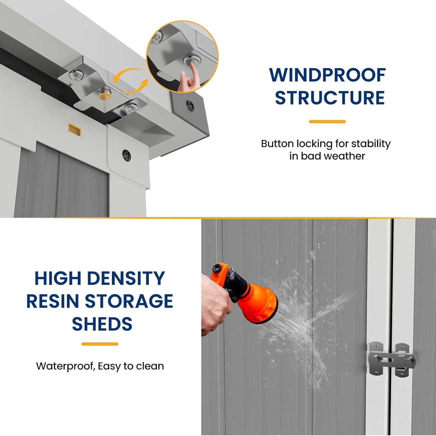 - 【DOUBLE-WALL PANELS】The outdoor storage shed features dual-wall resin panels that are processed with advanced technology for stronger wind & impact resistance; It won’t easily bend or puncture; Enjoy a secure place to store your valuable tools and equipment.