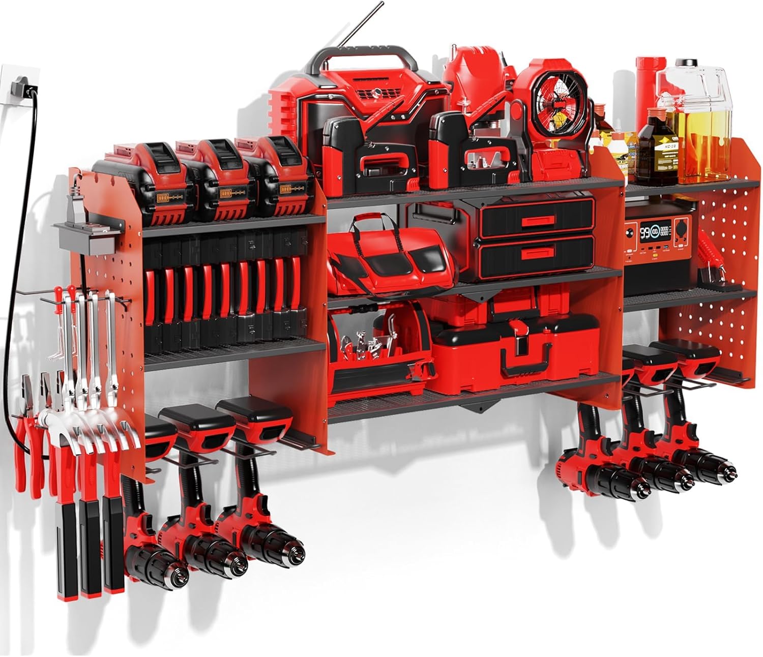 - Expanded Width to Maximized Storage: The Xankzi power tool organizer wall mount with charging station features a patented wide design in its 2 central shelves, perfect for storing more tools, especially longer items like chainsaws. Measuring 45.6" wide, 16.5" high, and 8.7" deep, this sturdy and space-efficient power tool storage rack keeps your tools organized
