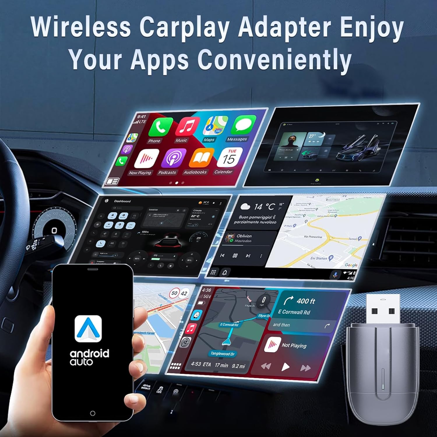 - 【2 in 1 Wireless Carplay Adapter 】This wireless carplay adapter comes with two USB-A ports and a Type-C port. Makes moving around efficient without connecting and disconnecting wires, reducing wear on your charging cable