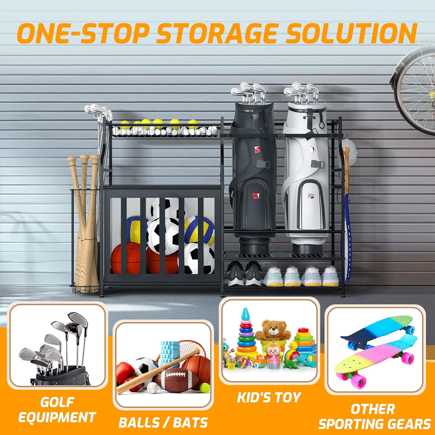 - 【All-in-One Sports Gear Storage】: This versatile garage storage rack features multiple compartments for a variety of gear, including basketballs, soccer balls, golf clubs, baseball bats, helmets, toys, and more. Perfect for families seeking to keep their garage or home organized.