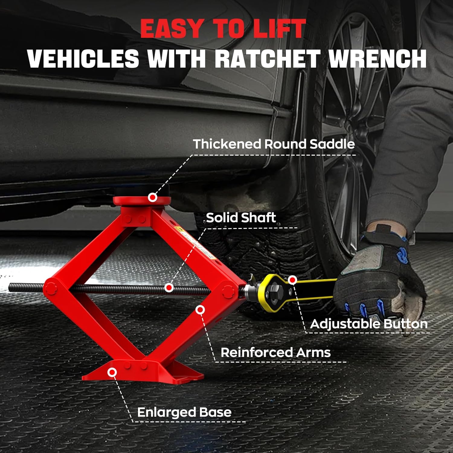 - 【Reliable and Durable】This jack for car is made of high-strength cold-rolled steel with an enlarged base that ensures its stability during lifting; it comes with two non-slip Jack rubber pads that match it, which protects the car from steel beam scratches while lifting and suit for most Car.