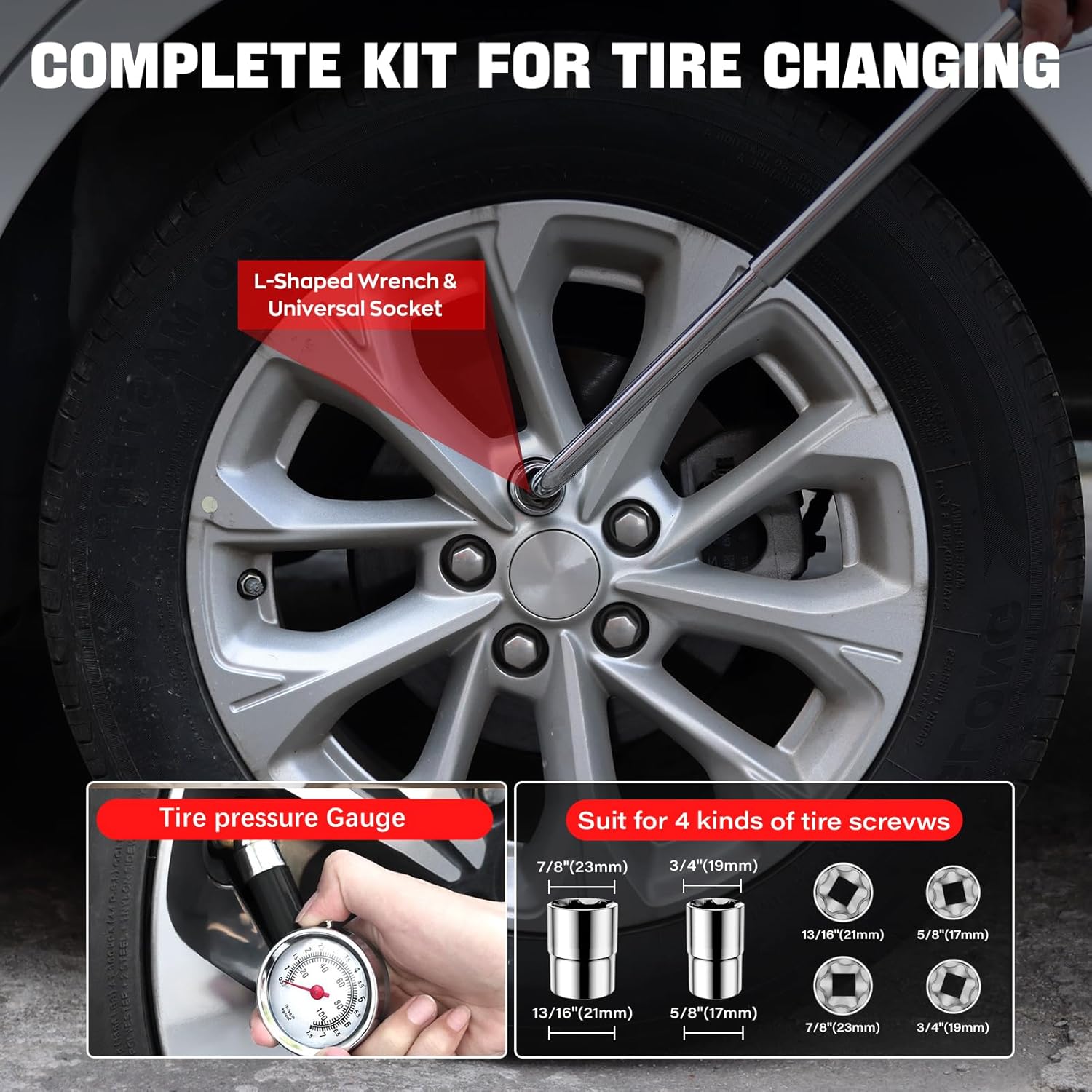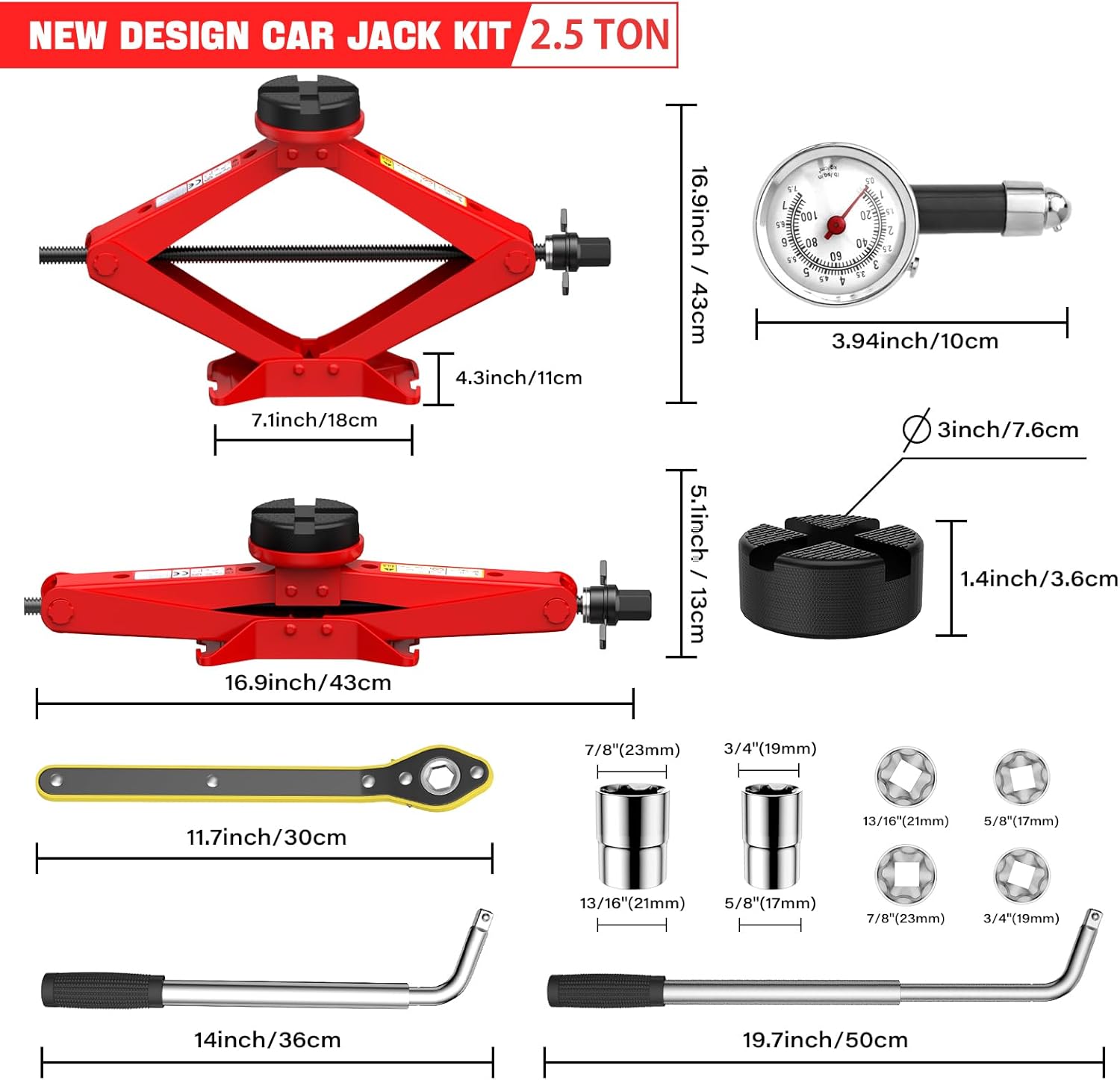- 【Complete Tire Changing Kit】2.5T Scissor jack x 1; Rubber Pad x 2 ; Ratchet Wrenchx 1; Lug Wrench x 1; Pressure Gauge x 1; Storage Bag x 1.he all-inclusive kit fits perfectly in your trunk or garage, ready to tackle any emergency tire replacement job.