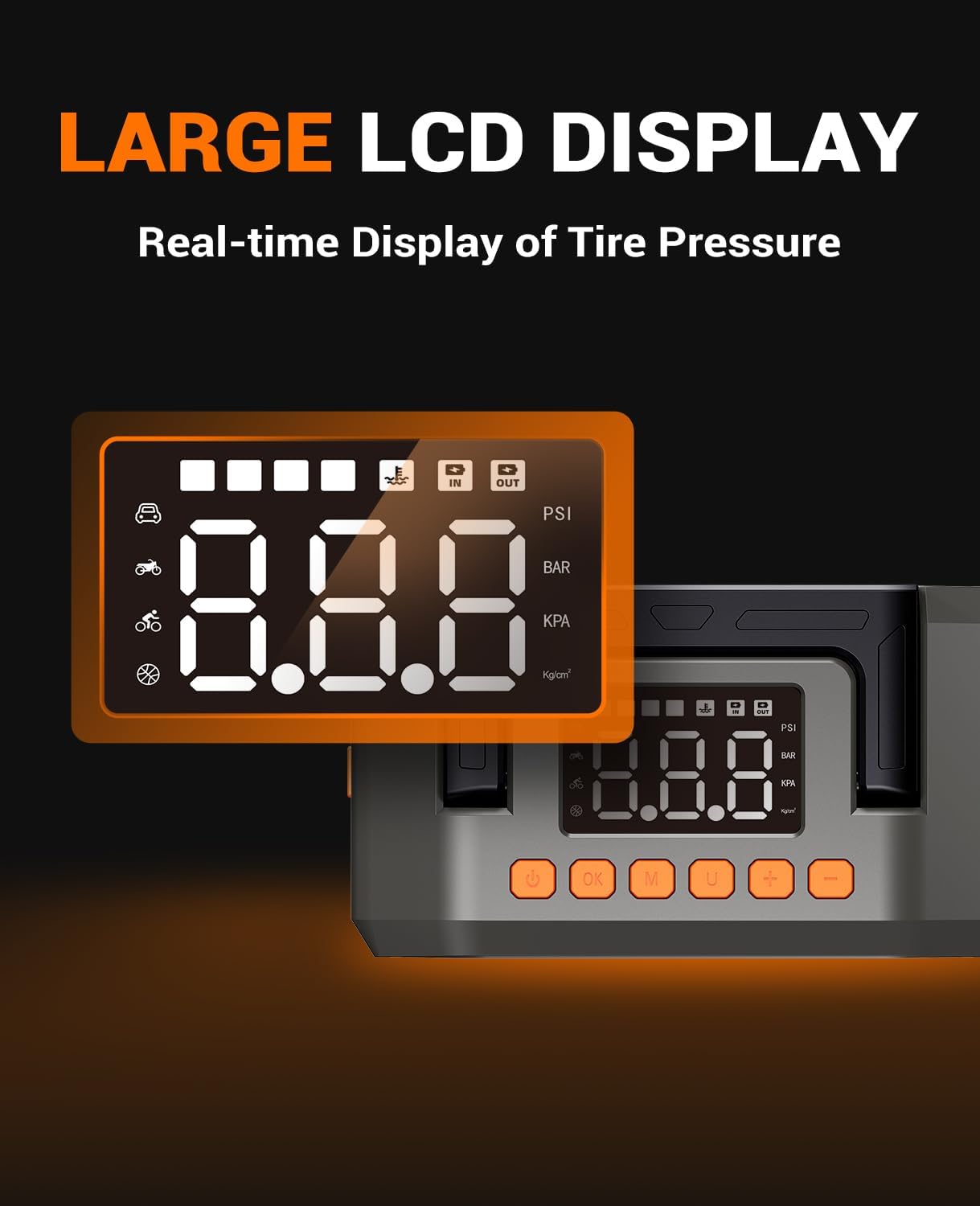 - LARGE LCD SCREEN: with clear readability, even under bright sunlight, the jumper box provides real-time updates on operational status, battery level, and error codes, allowing you to stay informed at all times. When using the air compressor function, the screen displays both preset and current pressure values, enabling you to monitor the inflation process easily.